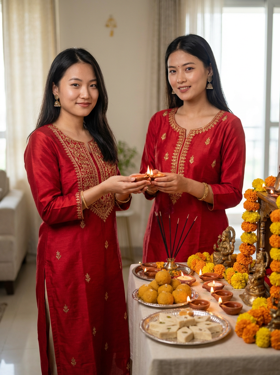 A photo with a model posing around a decorated puja area, with candles, diyas, and traditional Indian sweets on display.
