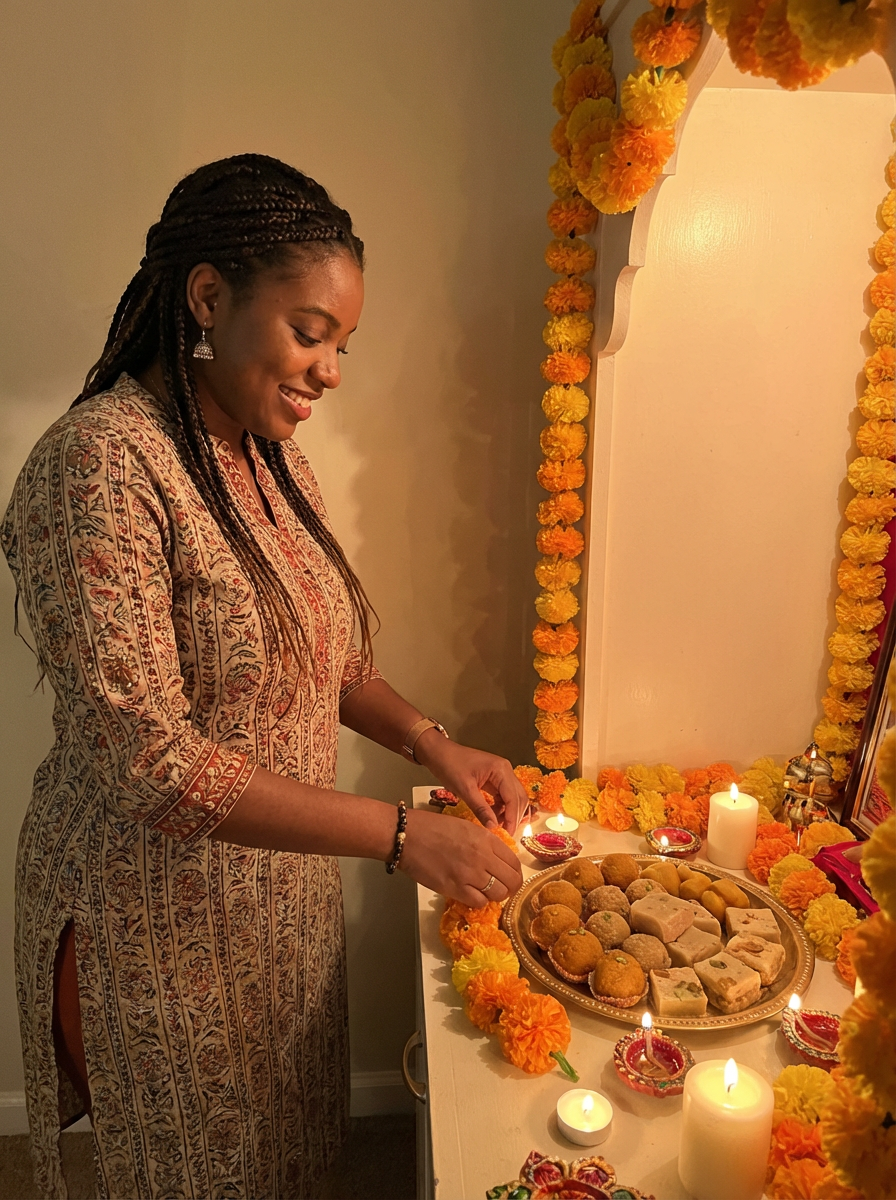 A photo with a model posing around a decorated puja area, with candles, diyas, and traditional Indian sweets on display.