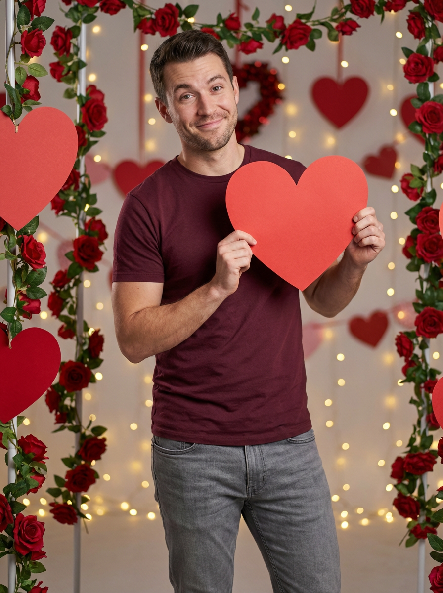 A playful model posing with giant heart decorations, surrounded by roses and festive Valentine's lights.