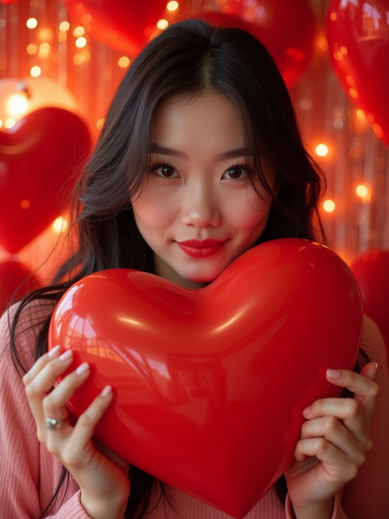 A playful model posing with giant heart decorations, surrounded by roses and festive Valentine's lights.