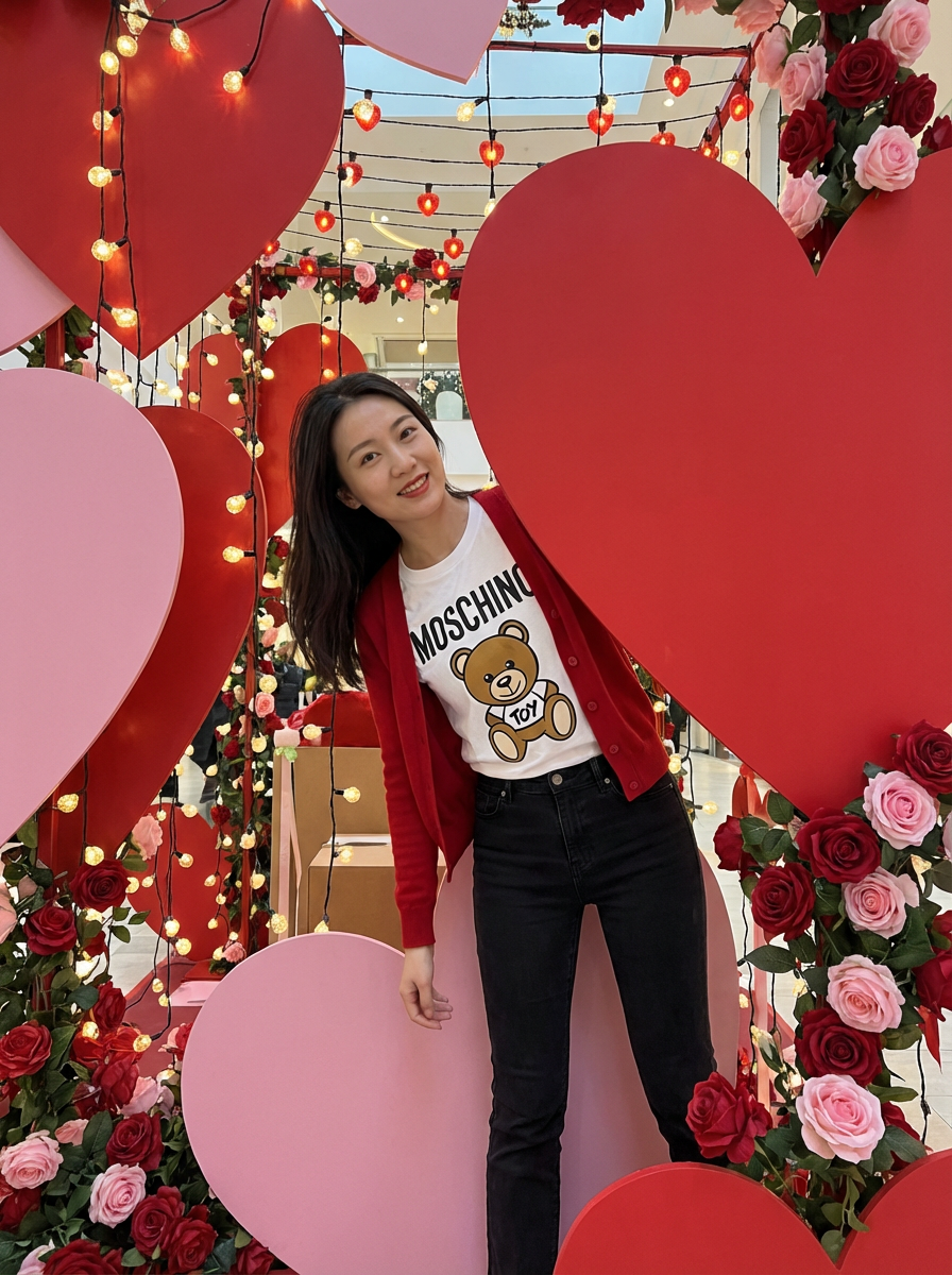 A playful model posing with giant heart decorations, surrounded by roses and festive Valentine's lights.