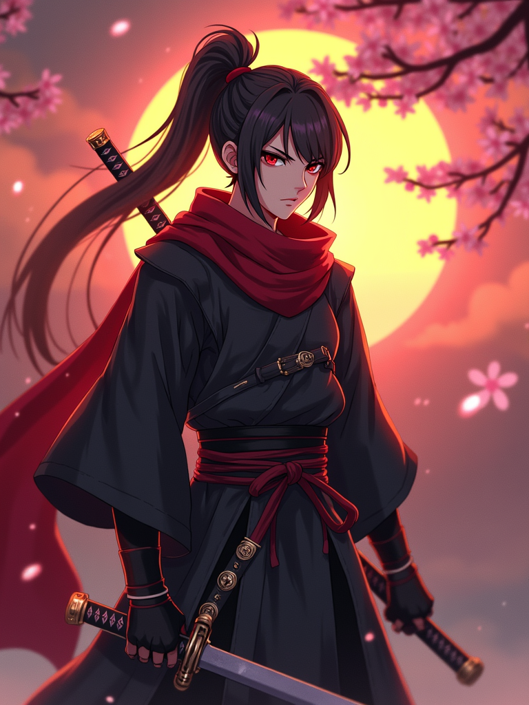 A powerful samurai anime avatar, holding a katana, wearing a dark samurai armor with a flowing red scarf, intense gaze. The backdrop features a dramatic sunset and falling cherry blossoms.