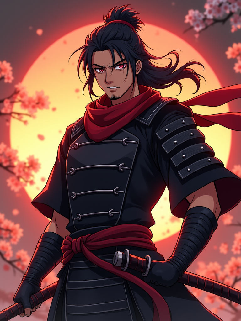 A powerful samurai anime avatar, holding a katana, wearing a dark samurai armor with a flowing red scarf, intense gaze. The backdrop features a dramatic sunset and falling cherry blossoms. the style is in anime illustration.