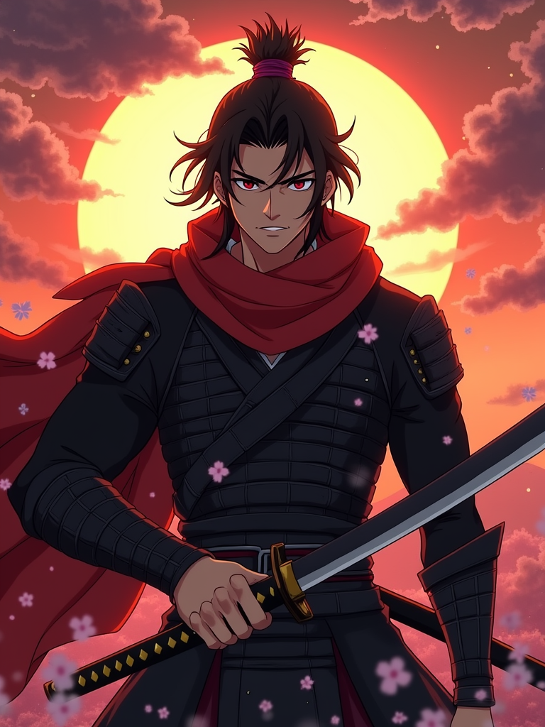 A powerful samurai anime avatar, holding a katana, wearing a dark samurai armor with a flowing red scarf, intense gaze. The backdrop features a dramatic sunset and falling cherry blossoms. the style is in anime illustration.