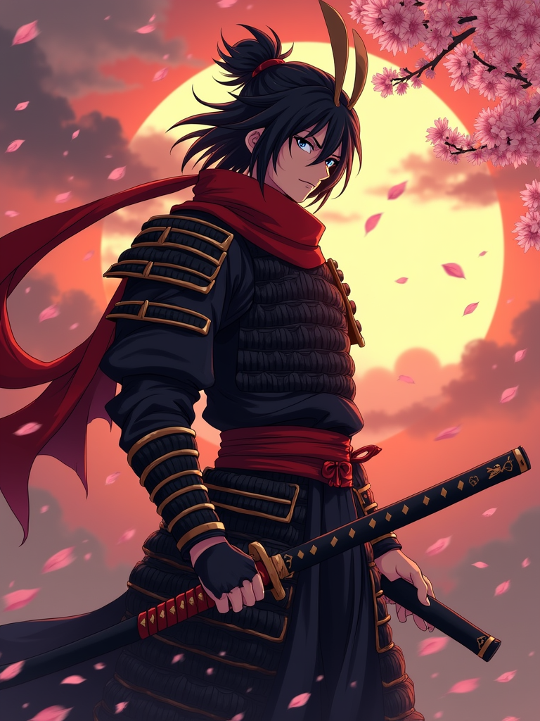 A powerful samurai anime avatar, holding a katana, wearing a dark samurai armor with a flowing red scarf, intense gaze. The backdrop features a dramatic sunset and falling cherry blossoms. the style is in anime illustration.