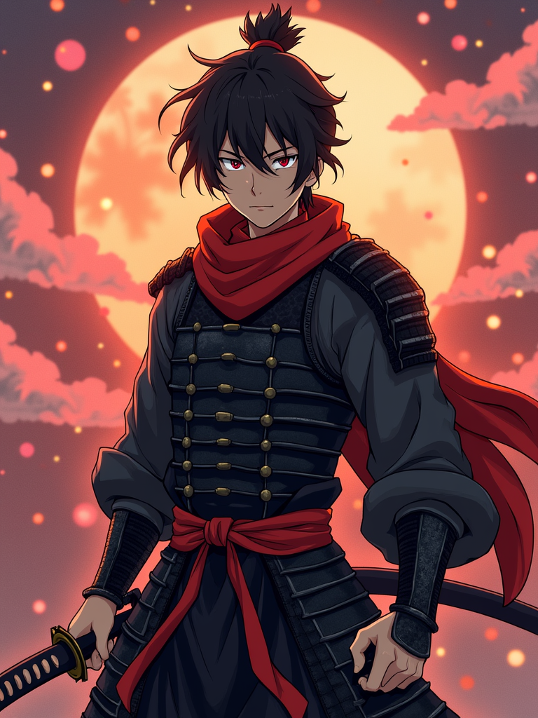 A powerful samurai anime avatar, holding a katana, wearing a dark samurai armor with a flowing red scarf, intense gaze. The backdrop features a dramatic sunset and falling cherry blossoms. the style is in anime illustration.