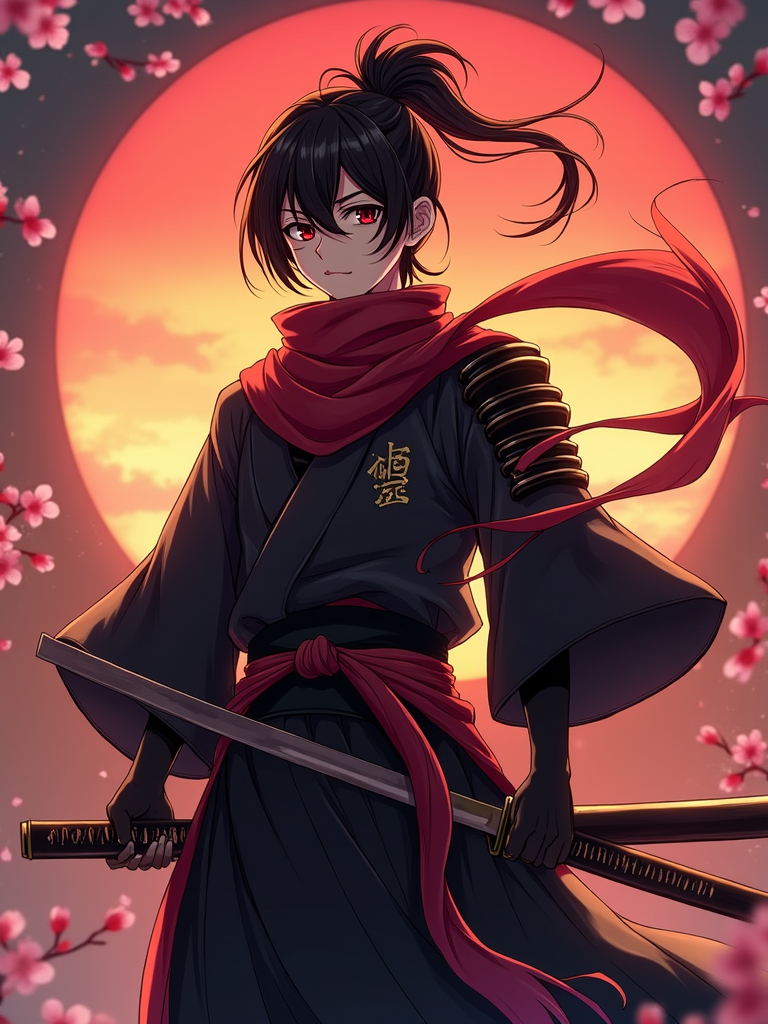 A powerful samurai anime avatar, holding a katana, wearing a dark samurai armor with a flowing red scarf, intense gaze. The backdrop features a dramatic sunset and falling cherry blossoms. the style is in anime illustration.