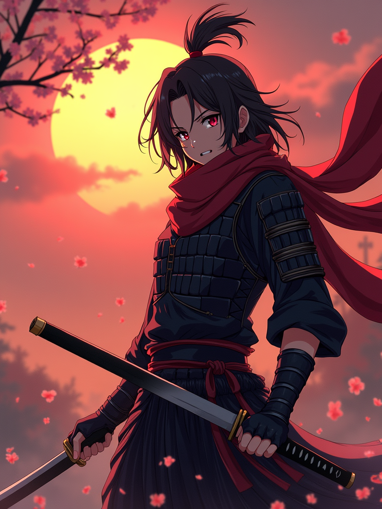 A powerful samurai anime avatar, holding a katana, wearing a dark samurai armor with a flowing red scarf, intense gaze. The backdrop features a dramatic sunset and falling cherry blossoms. the style is in anime illustration.