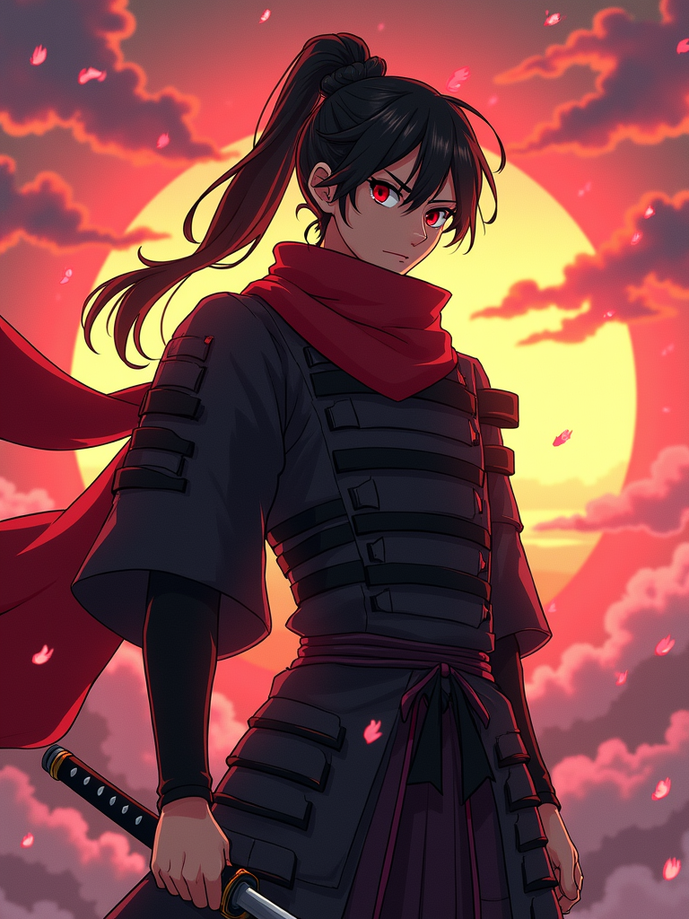 A powerful samurai anime avatar, holding a katana, wearing a dark samurai armor with a flowing red scarf, intense gaze. The backdrop features a dramatic sunset and falling cherry blossoms. the style is in anime illustration.