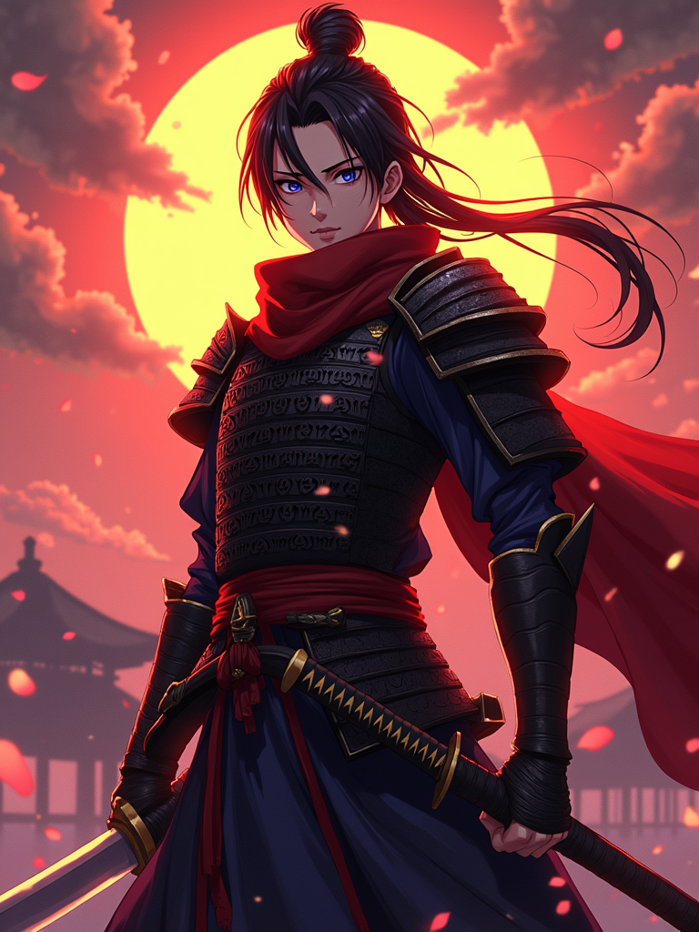 A powerful samurai anime avatar, holding a katana, wearing a dark samurai armor with a flowing red scarf, intense gaze. The backdrop features a dramatic sunset and falling cherry blossoms. the style is in anime illustration.