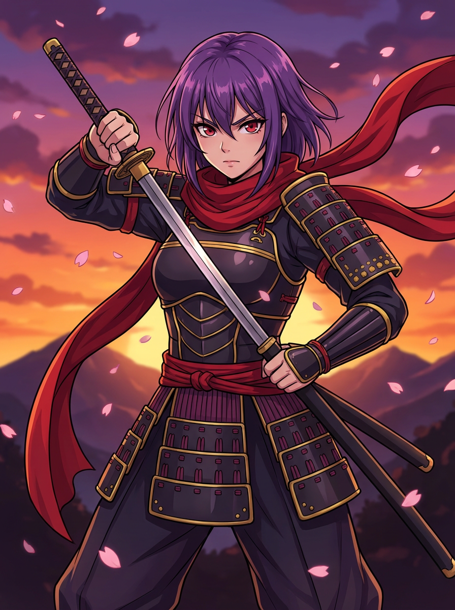 A powerful samurai anime avatar, holding a katana, wearing a dark samurai armor with a flowing red scarf, intense gaze. The backdrop features a dramatic sunset and falling cherry blossoms. the style is in anime illustration.