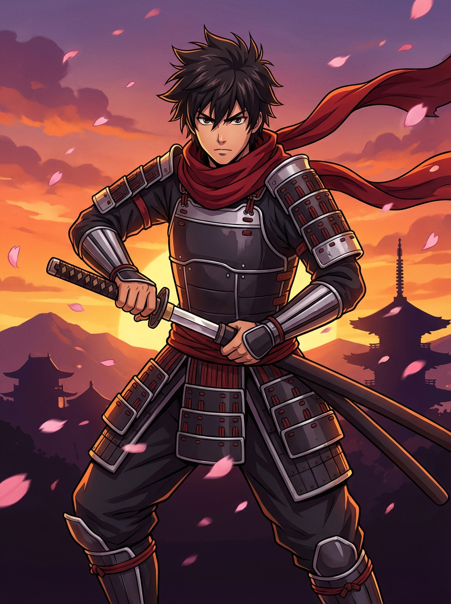 A powerful samurai anime avatar, holding a katana, wearing a dark samurai armor with a flowing red scarf, intense gaze. The backdrop features a dramatic sunset and falling cherry blossoms. the style is in anime illustration.