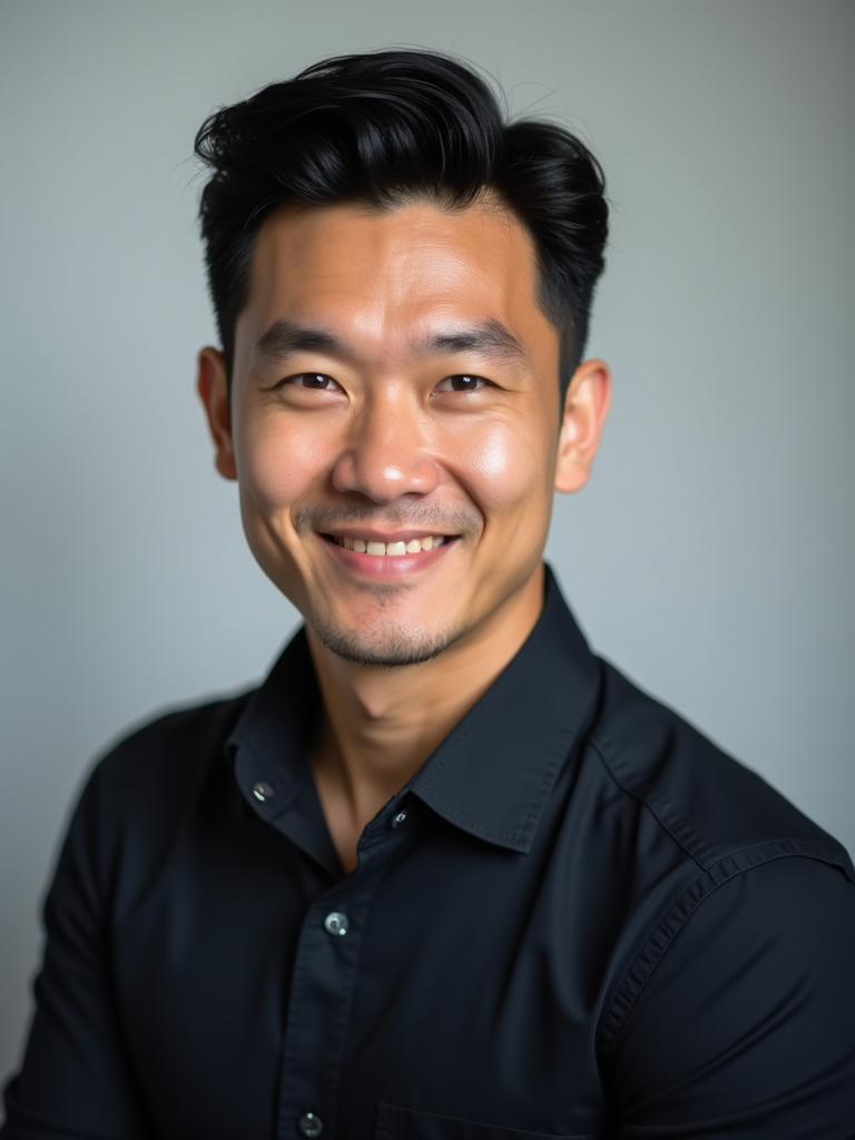 A professional actor headshot of a confident model, taken in a well-lit studio with a plain backdrop. The model is dressed in a fitted dark-colored shirt with neatly styled hair. The lighting is soft and even, highlighting their facial features with a natural and approachable expression. The focus is sharp, capturing the model's eyes and subtle smile, creating a perfect headshot for auditions and casting calls.