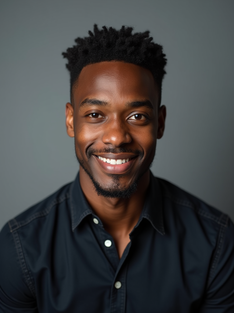 A professional actor headshot of a confident model, taken in a well-lit studio with a plain backdrop. The model is dressed in a fitted dark-colored shirt with neatly styled hair. The lighting is soft and even, highlighting their facial features with a natural and approachable expression. The focus is sharp, capturing the model's eyes and subtle smile, creating a perfect headshot for auditions and casting calls.