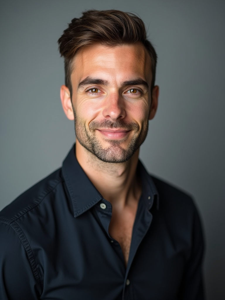 A professional actor headshot of a confident model, taken in a well-lit studio with a plain backdrop. The model is dressed in a fitted dark-colored shirt with neatly styled hair. The lighting is soft and even, highlighting their facial features with a natural and approachable expression. The focus is sharp, capturing the model's eyes and subtle smile, creating a perfect headshot for auditions and casting calls.