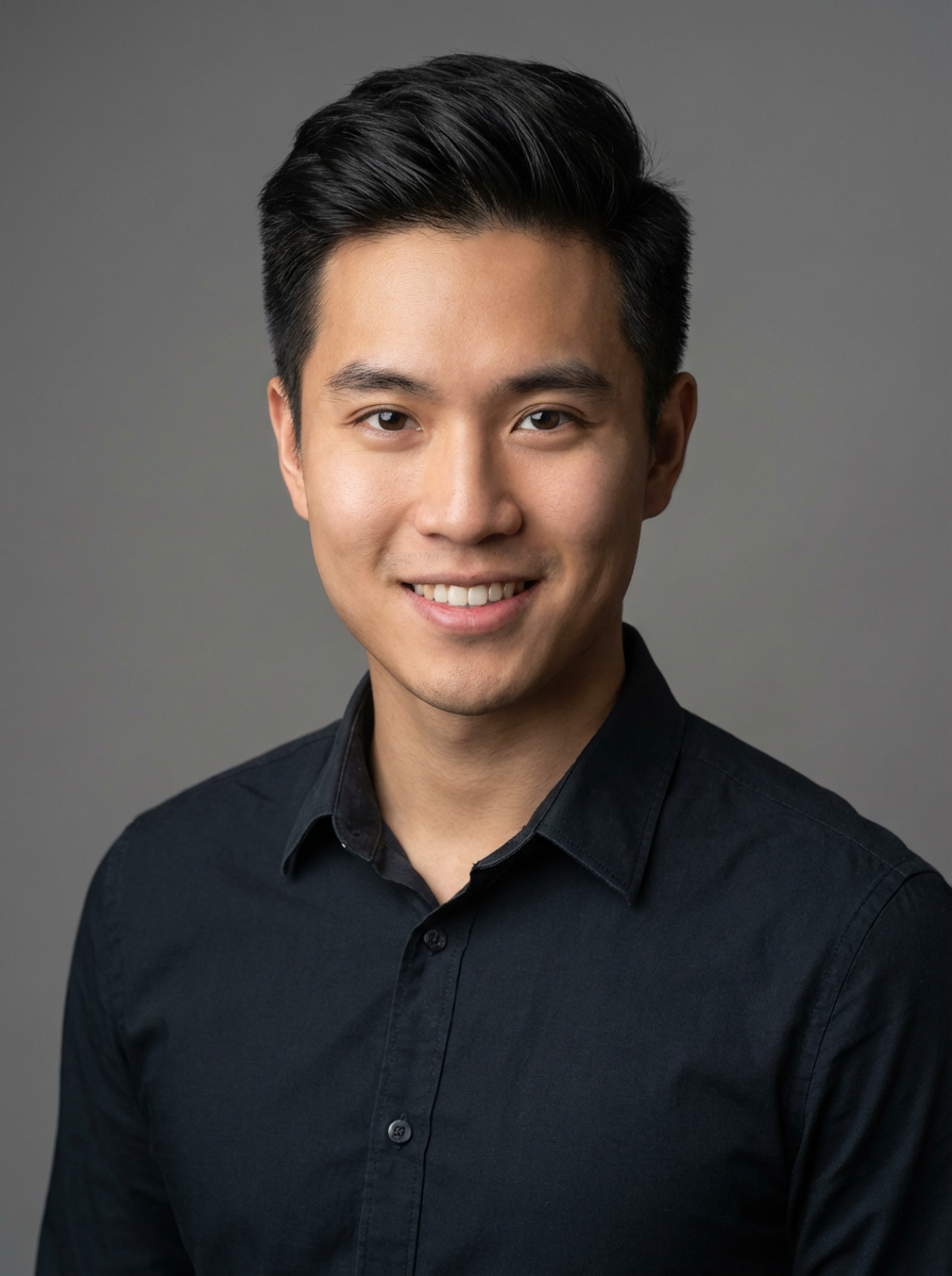 A professional actor headshot of a confident model, taken in a well-lit studio with a plain backdrop. The model is dressed in a fitted dark-colored shirt with neatly styled hair. The lighting is soft and even, highlighting their facial features with a natural and approachable expression. The focus is sharp, capturing the model's eyes and subtle smile, creating a perfect headshot for auditions and casting calls.