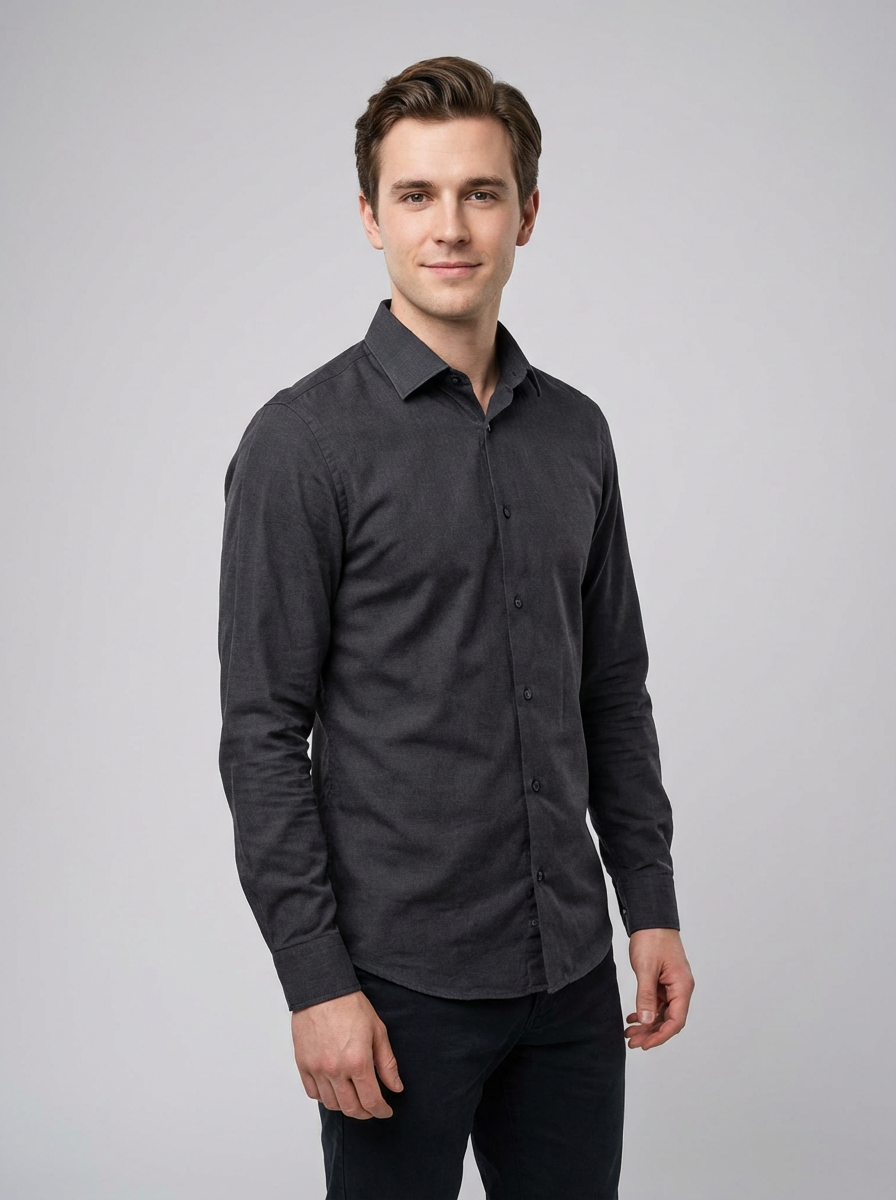 A professional actor headshot of a confident model, taken in a well-lit studio with a plain backdrop. The model is dressed in a fitted dark-colored shirt with neatly styled hair. The lighting is soft and even, highlighting their facial features with a natural and approachable expression. The focus is sharp, capturing the model's eyes and subtle smile, creating a perfect headshot for auditions and casting calls.