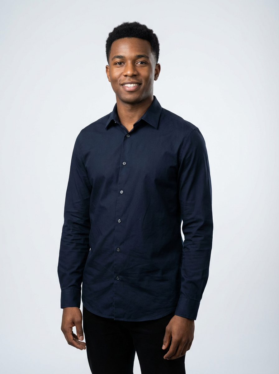 A professional actor headshot of a confident model, taken in a well-lit studio with a plain backdrop. The model is dressed in a fitted dark-colored shirt with neatly styled hair. The lighting is soft and even, highlighting their facial features with a natural and approachable expression. The focus is sharp, capturing the model's eyes and subtle smile, creating a perfect headshot for auditions and casting calls.