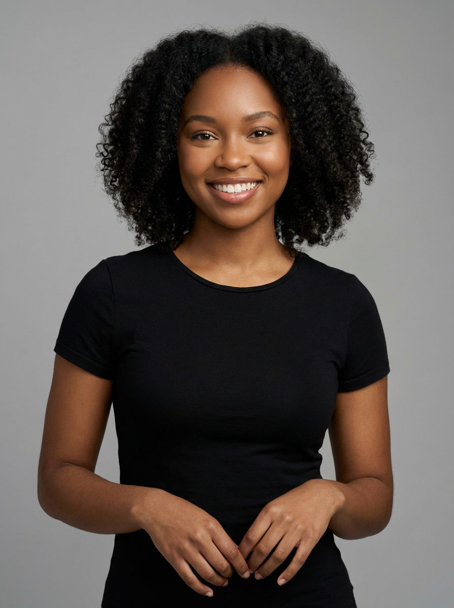 A professional actor headshot of a confident model, taken in a well-lit studio with a plain backdrop. The model is dressed in a simple, elegant black top with natural makeup and soft curls . The lighting is soft and even, highlighting their facial features with a natural and approachable expression. The focus is sharp, capturing the model's eyes and subtle smile, creating a perfect headshot for auditions and casting calls.