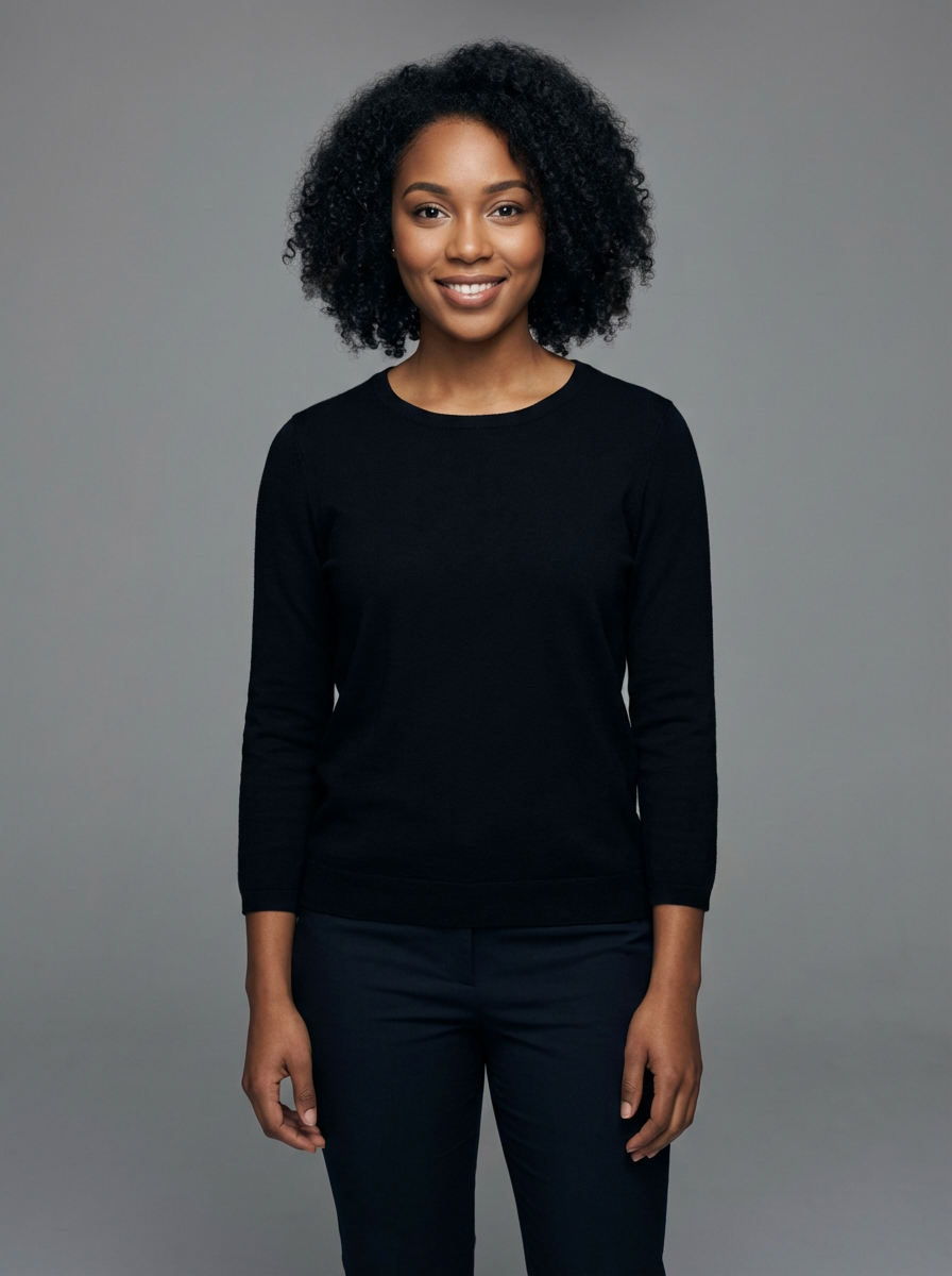 A professional actor headshot of a confident model, taken in a well-lit studio with a plain backdrop. The model is dressed in a simple, elegant black top with natural makeup and soft curls . The lighting is soft and even, highlighting their facial features with a natural and approachable expression. The focus is sharp, capturing the model's eyes and subtle smile, creating a perfect headshot for auditions and casting calls.