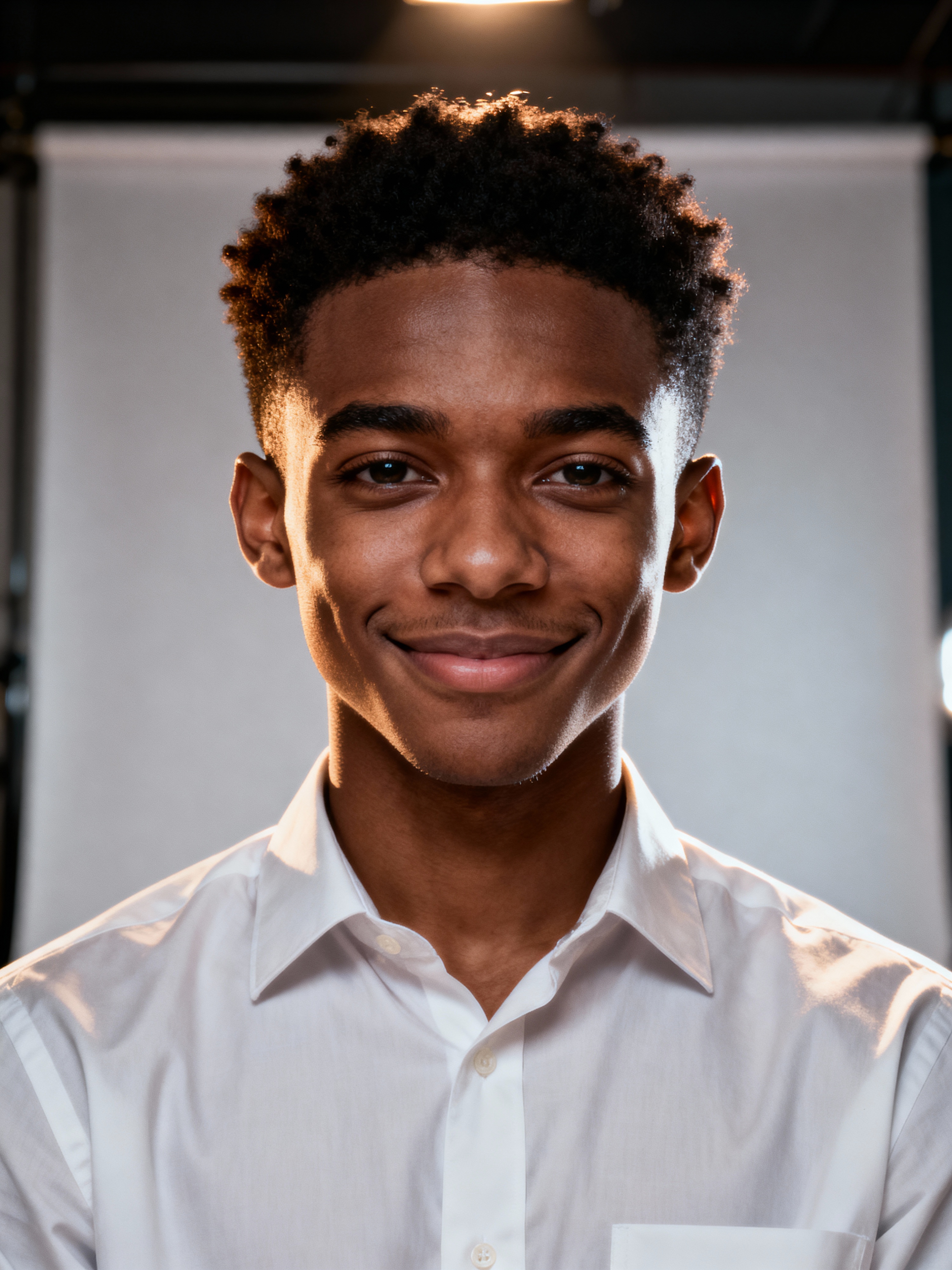 A professional author headshot of a thoughtful model, taken in a well-lit studio with a plain backdrop. The model is dressed in a neat, light-colored shirt with a reflective expression. The lighting is soft and even, highlighting their facial features with a warm and intellectual expression. The focus is sharp, capturing the model's eyes and thoughtful smile, creating a perfect headshot for book covers and professional profiles.