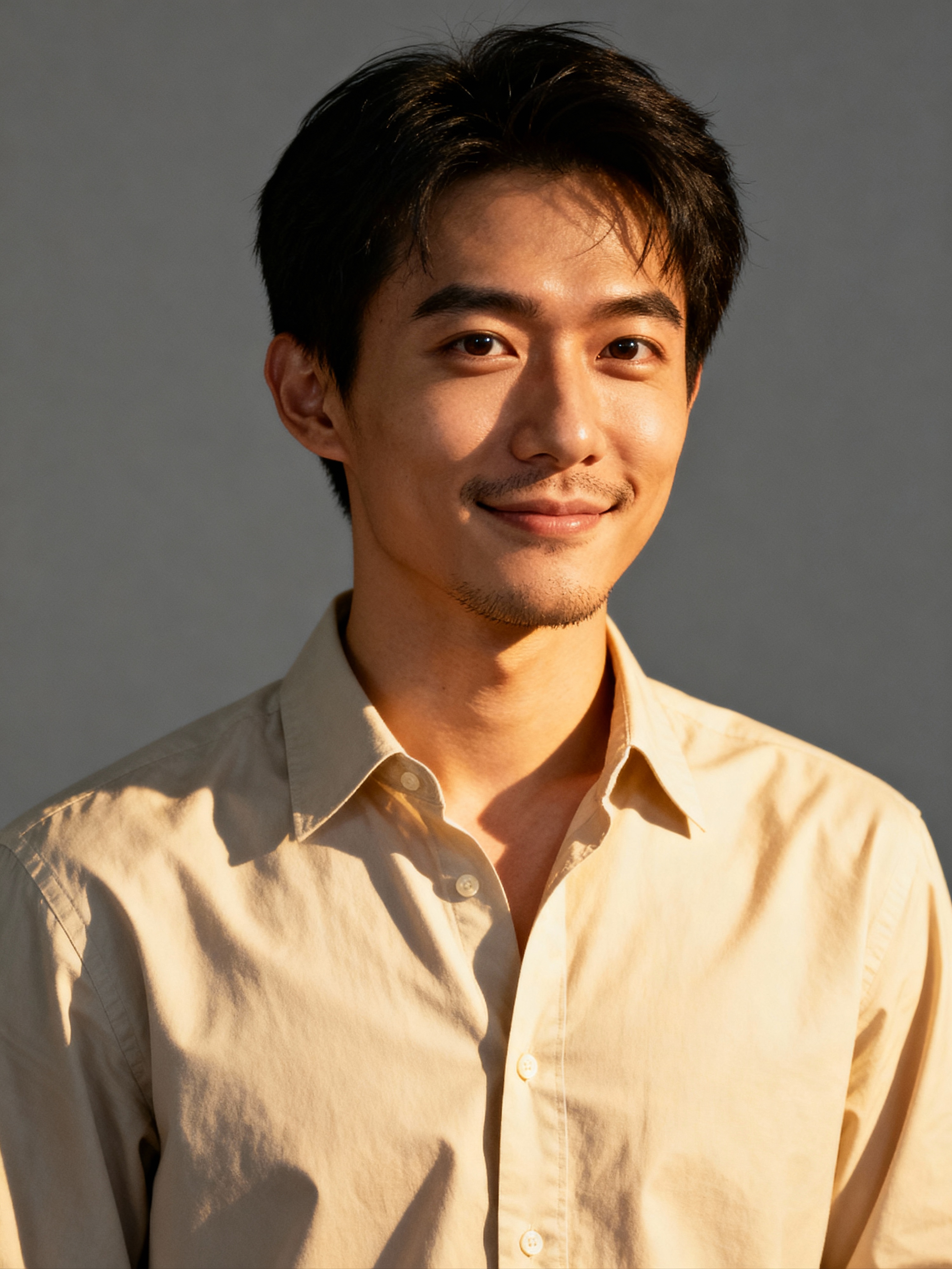 A professional author headshot of a thoughtful model, taken in a well-lit studio with a plain backdrop. The model is dressed in a neat, light-colored shirt with a reflective expression. The lighting is soft and even, highlighting their facial features with a warm and intellectual expression. The focus is sharp, capturing the model's eyes and thoughtful smile, creating a perfect headshot for book covers and professional profiles.