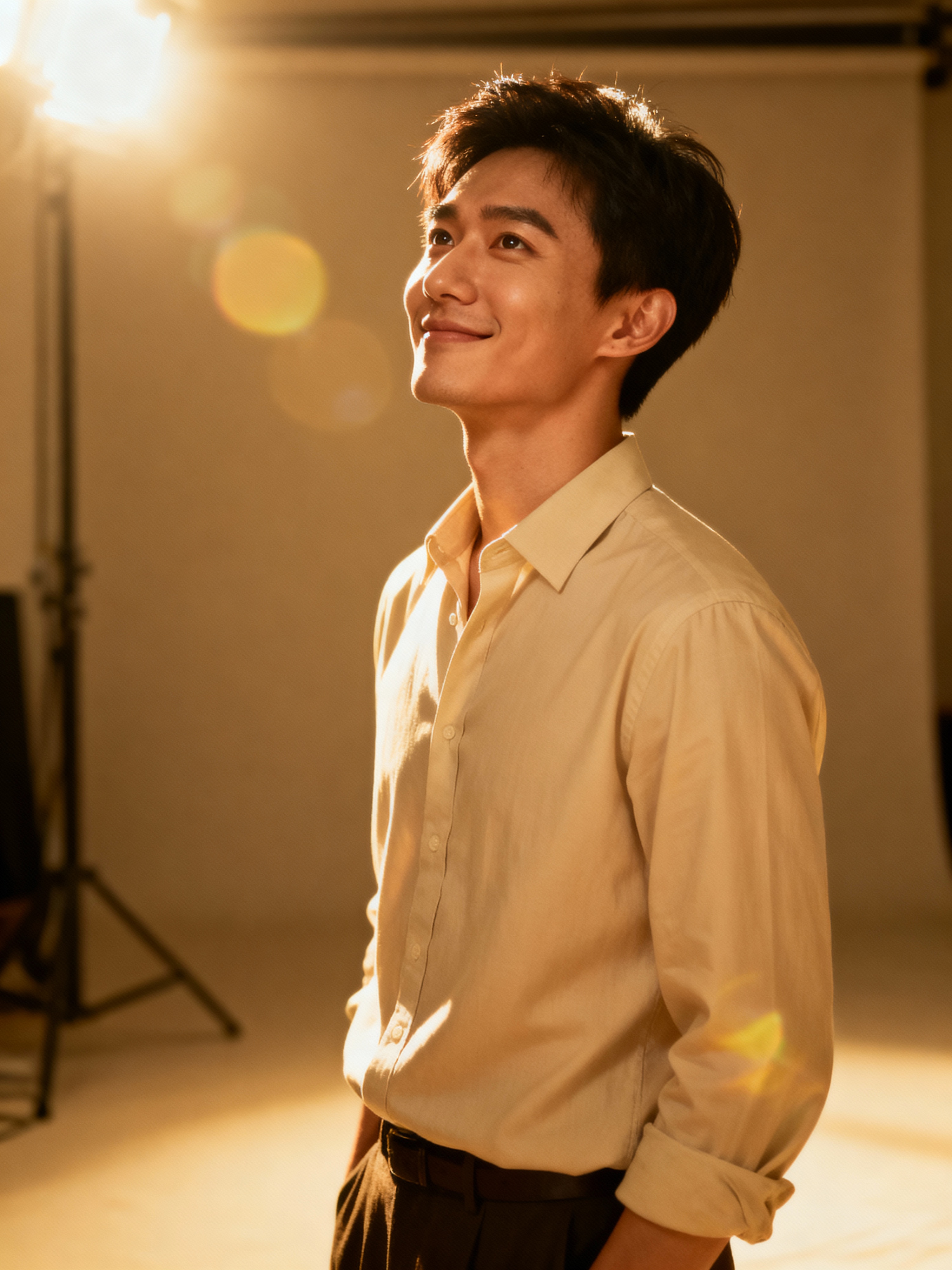 A professional author headshot of a thoughtful model, taken in a well-lit studio with a plain backdrop. The model is dressed in a neat, light-colored shirt with a reflective expression. The lighting is soft and even, highlighting their facial features with a warm and intellectual expression. The focus is sharp, capturing the model's eyes and thoughtful smile, creating a perfect headshot for book covers and professional profiles.