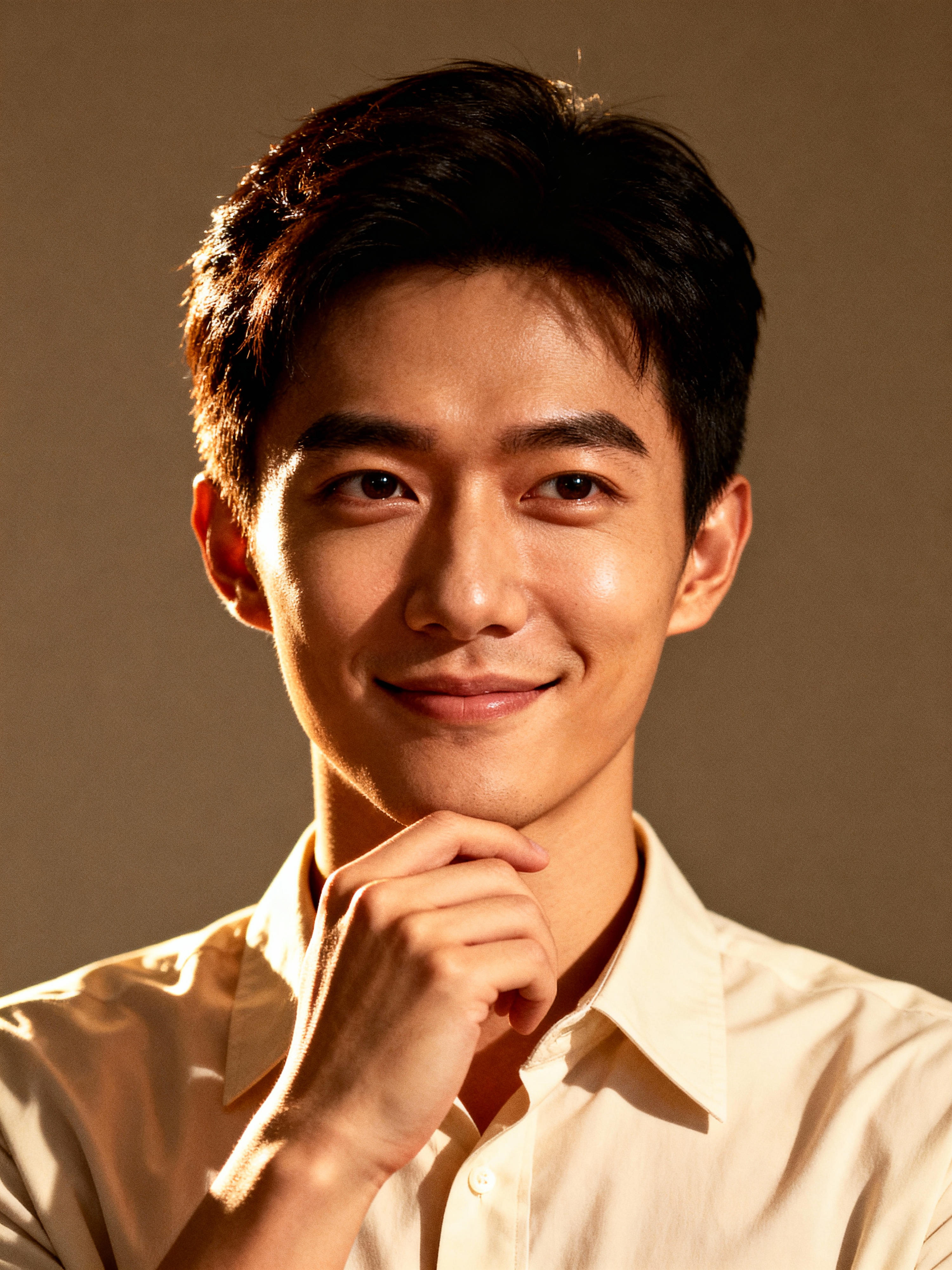 A professional author headshot of a thoughtful model, taken in a well-lit studio with a plain backdrop. The model is dressed in a neat, light-colored shirt with a reflective expression. The lighting is soft and even, highlighting their facial features with a warm and intellectual expression. The focus is sharp, capturing the model's eyes and thoughtful smile, creating a perfect headshot for book covers and professional profiles.