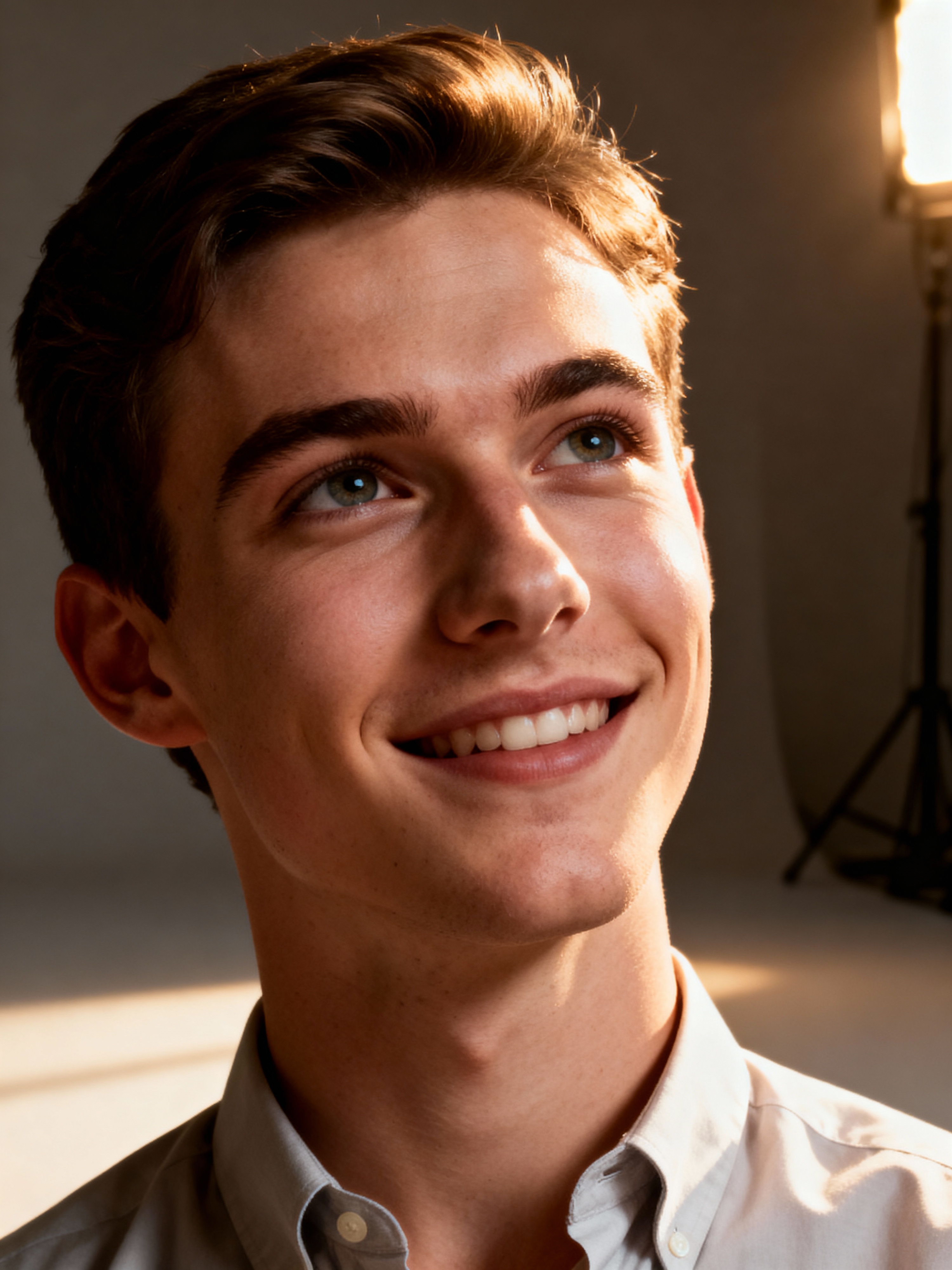 A professional author headshot of a thoughtful model, taken in a well-lit studio with a plain backdrop. The model is dressed in a neat, light-colored shirt with a reflective expression. The lighting is soft and even, highlighting their facial features with a warm and intellectual expression. The focus is sharp, capturing the model's eyes and thoughtful smile, creating a perfect headshot for book covers and professional profiles.