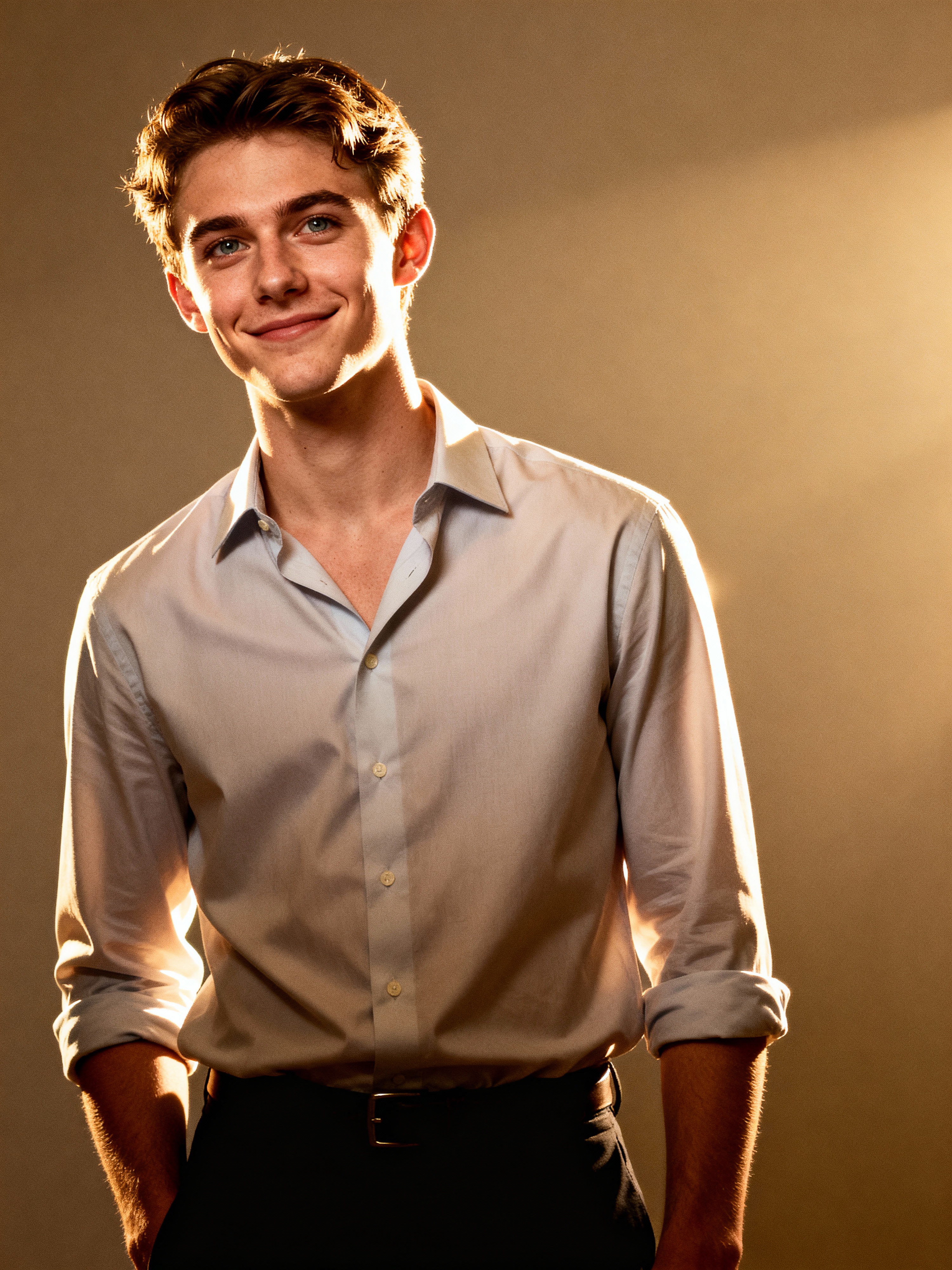 A professional author headshot of a thoughtful model, taken in a well-lit studio with a plain backdrop. The model is dressed in a neat, light-colored shirt with a reflective expression. The lighting is soft and even, highlighting their facial features with a warm and intellectual expression. The focus is sharp, capturing the model's eyes and thoughtful smile, creating a perfect headshot for book covers and professional profiles.