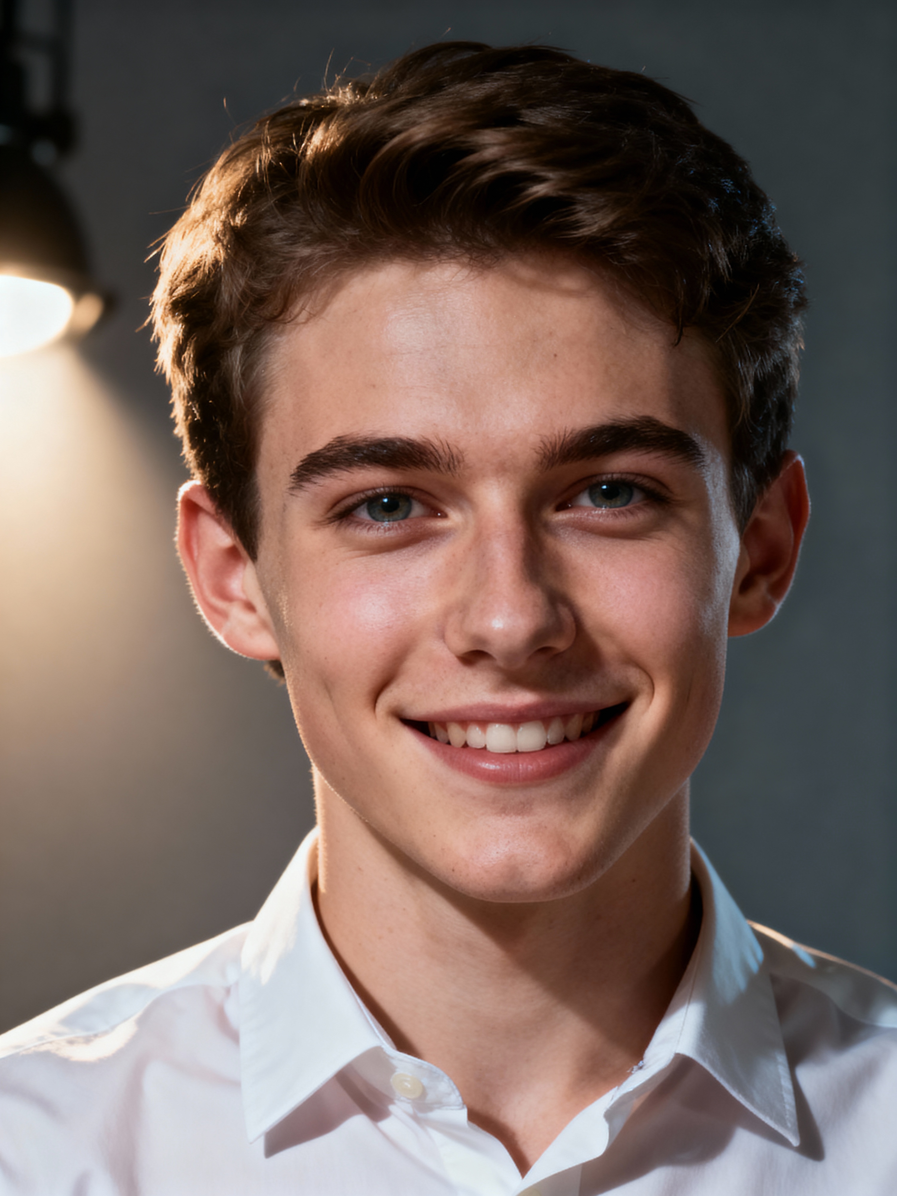 A professional author headshot of a thoughtful model, taken in a well-lit studio with a plain backdrop. The model is dressed in a neat, light-colored shirt with a reflective expression. The lighting is soft and even, highlighting their facial features with a warm and intellectual expression. The focus is sharp, capturing the model's eyes and thoughtful smile, creating a perfect headshot for book covers and professional profiles.
