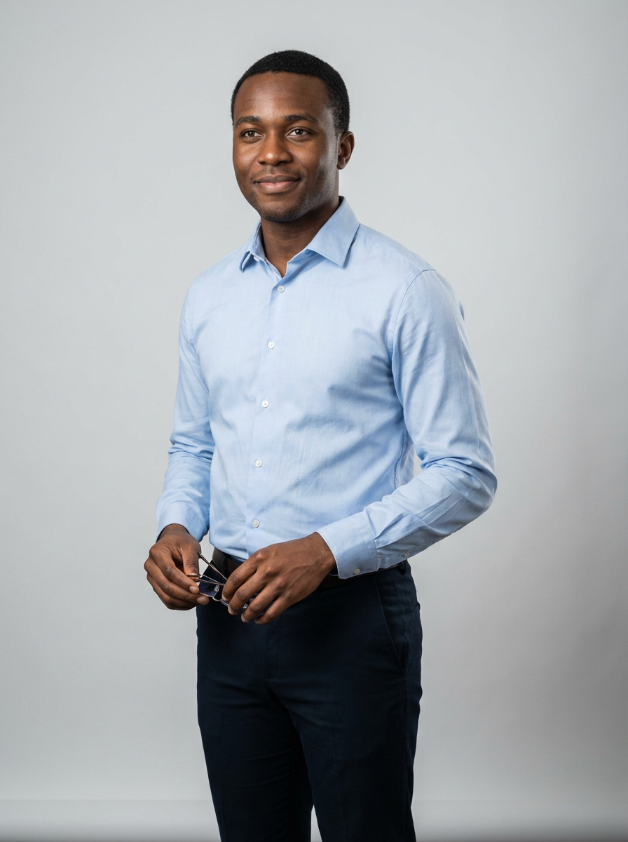 A professional author headshot of a thoughtful model, taken in a well-lit studio with a plain backdrop. The model is dressed in a neat, light-colored shirt with a reflective expression. The lighting is soft and even, highlighting their facial features with a warm and intellectual expression. The focus is sharp, capturing the model's eyes and thoughtful smile, creating a perfect headshot for book covers and professional profiles.