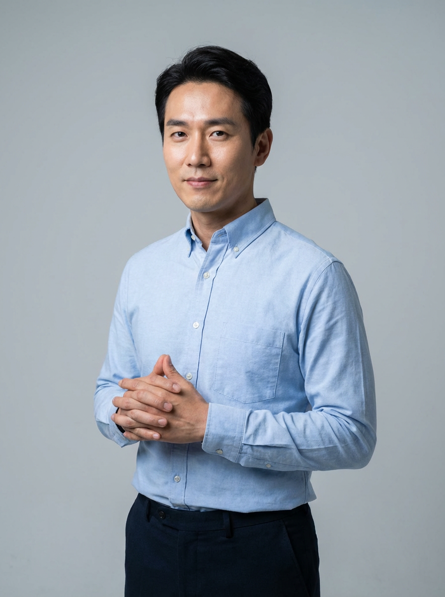 A professional author headshot of a thoughtful model, taken in a well-lit studio with a plain backdrop. The model is dressed in a neat, light-colored shirt with a reflective expression. The lighting is soft and even, highlighting their facial features with a warm and intellectual expression. The focus is sharp, capturing the model's eyes and thoughtful smile, creating a perfect headshot for book covers and professional profiles.