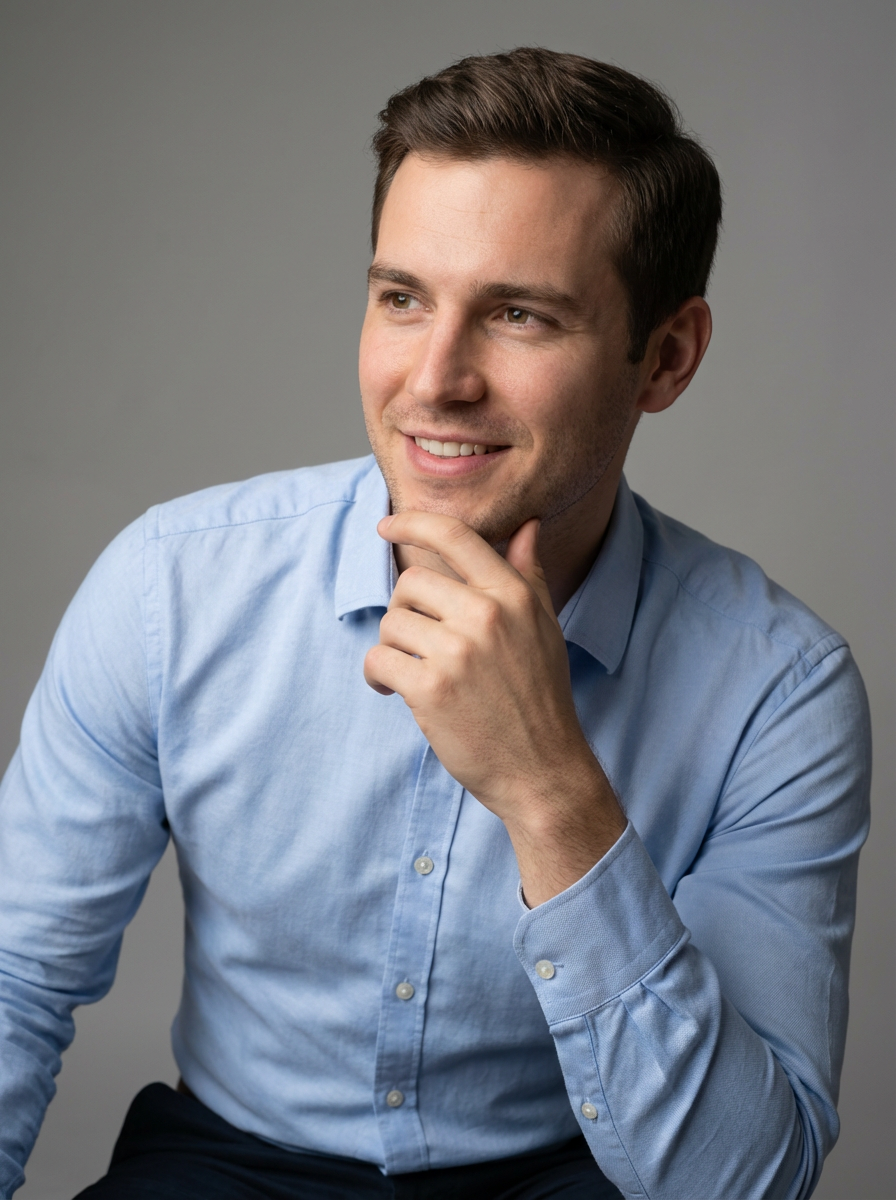 A professional author headshot of a thoughtful model, taken in a well-lit studio with a plain backdrop. The model is dressed in a neat, light-colored shirt with a reflective expression. The lighting is soft and even, highlighting their facial features with a warm and intellectual expression. The focus is sharp, capturing the model's eyes and thoughtful smile, creating a perfect headshot for book covers and professional profiles.