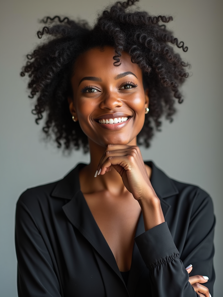 A professional author headshot of a thoughtful model, taken in a well-lit studio with a plain backdrop. The model is dressed in a stylish, professional blouse with natural makeup and a contemplative smile . The lighting is soft and even, highlighting their facial features with a warm and intellectual expression. The focus is sharp, capturing the model's eyes and thoughtful smile, creating a perfect headshot for book covers and professional profiles.