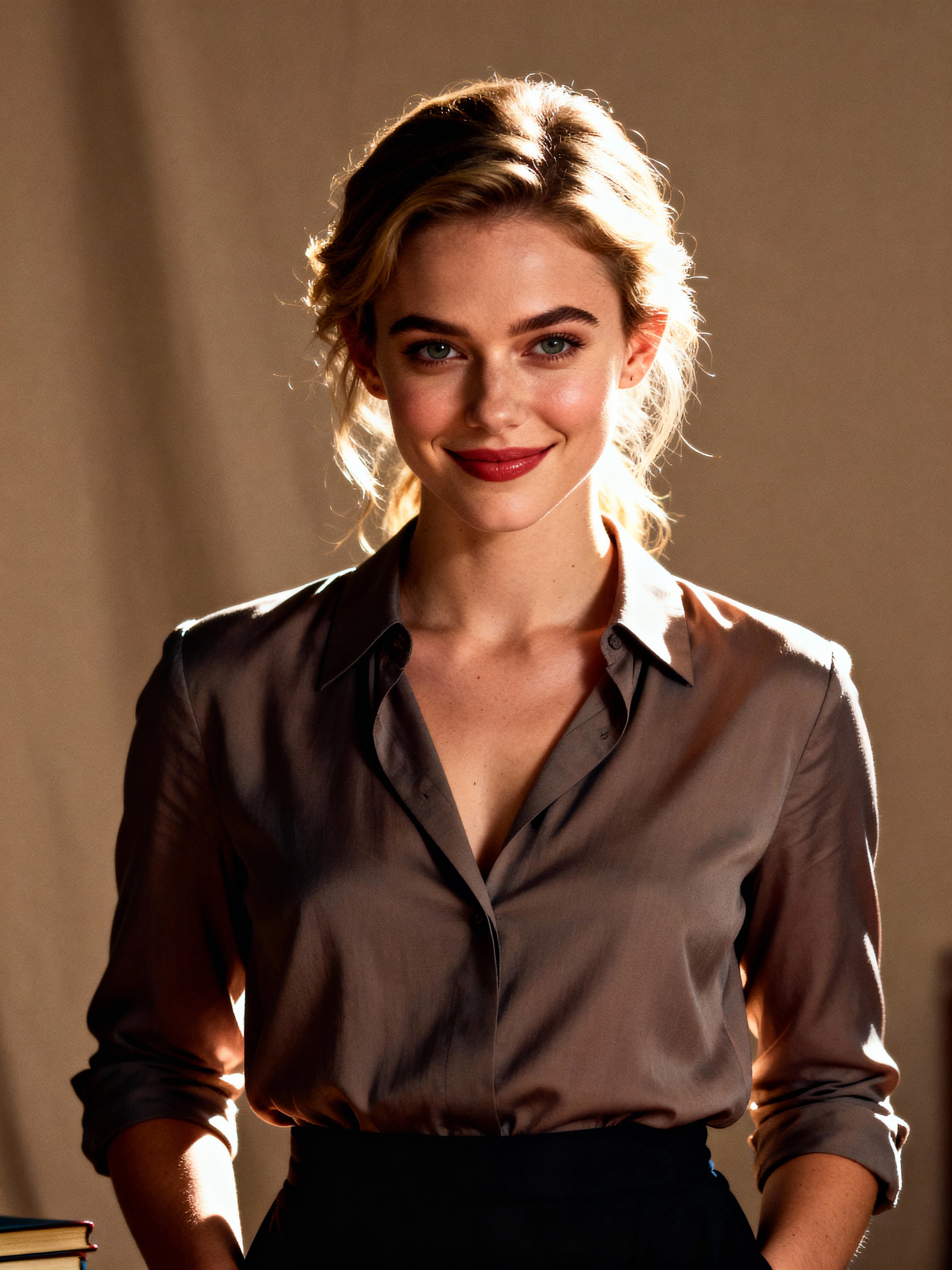 A professional author headshot of a thoughtful model, taken in a well-lit studio with a plain backdrop. The model is dressed in a stylish, professional blouse with natural makeup and a contemplative smile . The lighting is soft and even, highlighting their facial features with a warm and intellectual expression. The focus is sharp, capturing the model's eyes and thoughtful smile, creating a perfect headshot for book covers and professional profiles.