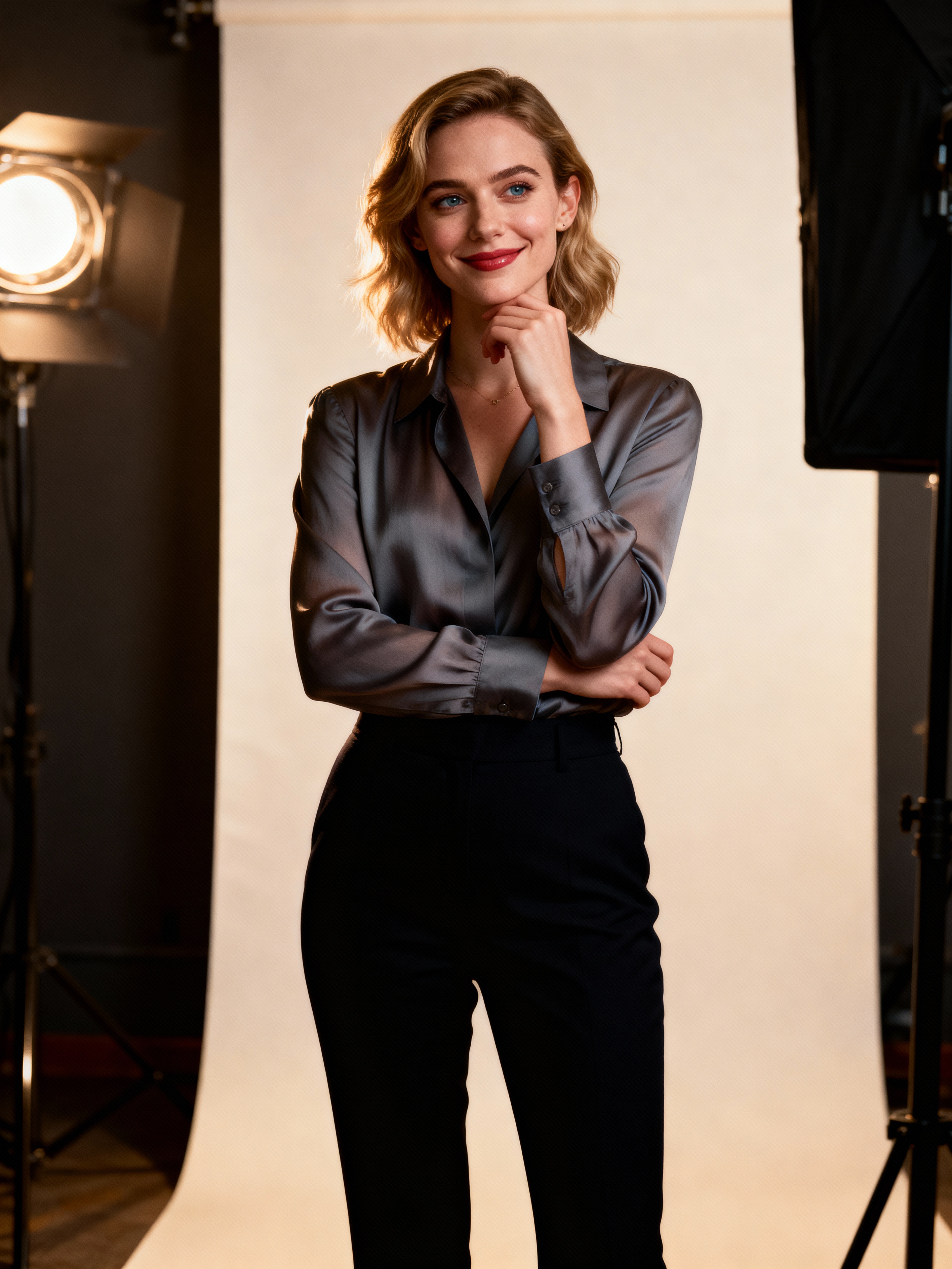 A professional author headshot of a thoughtful model, taken in a well-lit studio with a plain backdrop. The model is dressed in a stylish, professional blouse with natural makeup and a contemplative smile . The lighting is soft and even, highlighting their facial features with a warm and intellectual expression. The focus is sharp, capturing the model's eyes and thoughtful smile, creating a perfect headshot for book covers and professional profiles.