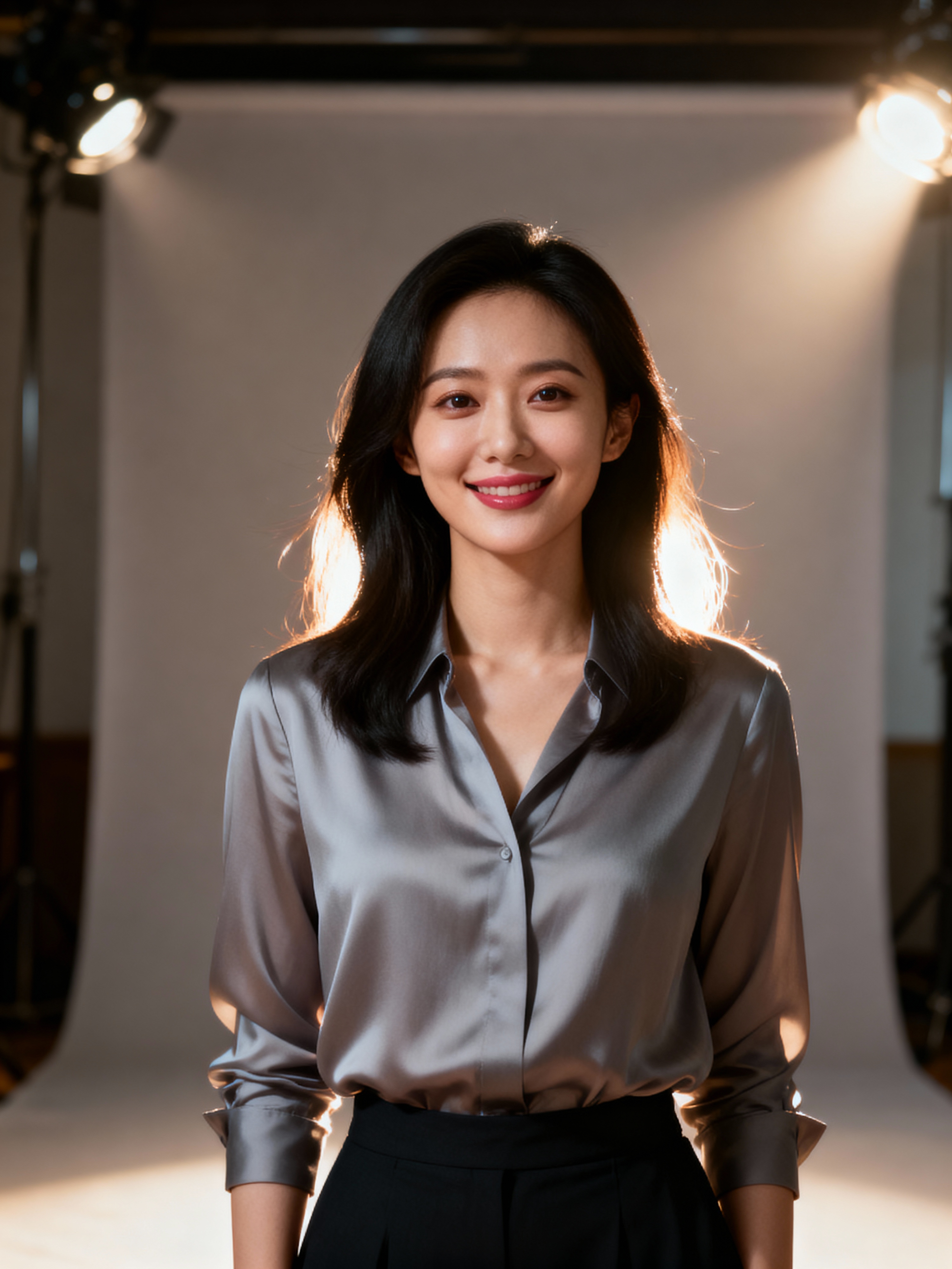 A professional author headshot of a thoughtful model, taken in a well-lit studio with a plain backdrop. The model is dressed in a stylish, professional blouse with natural makeup and a contemplative smile . The lighting is soft and even, highlighting their facial features with a warm and intellectual expression. The focus is sharp, capturing the model's eyes and thoughtful smile, creating a perfect headshot for book covers and professional profiles.