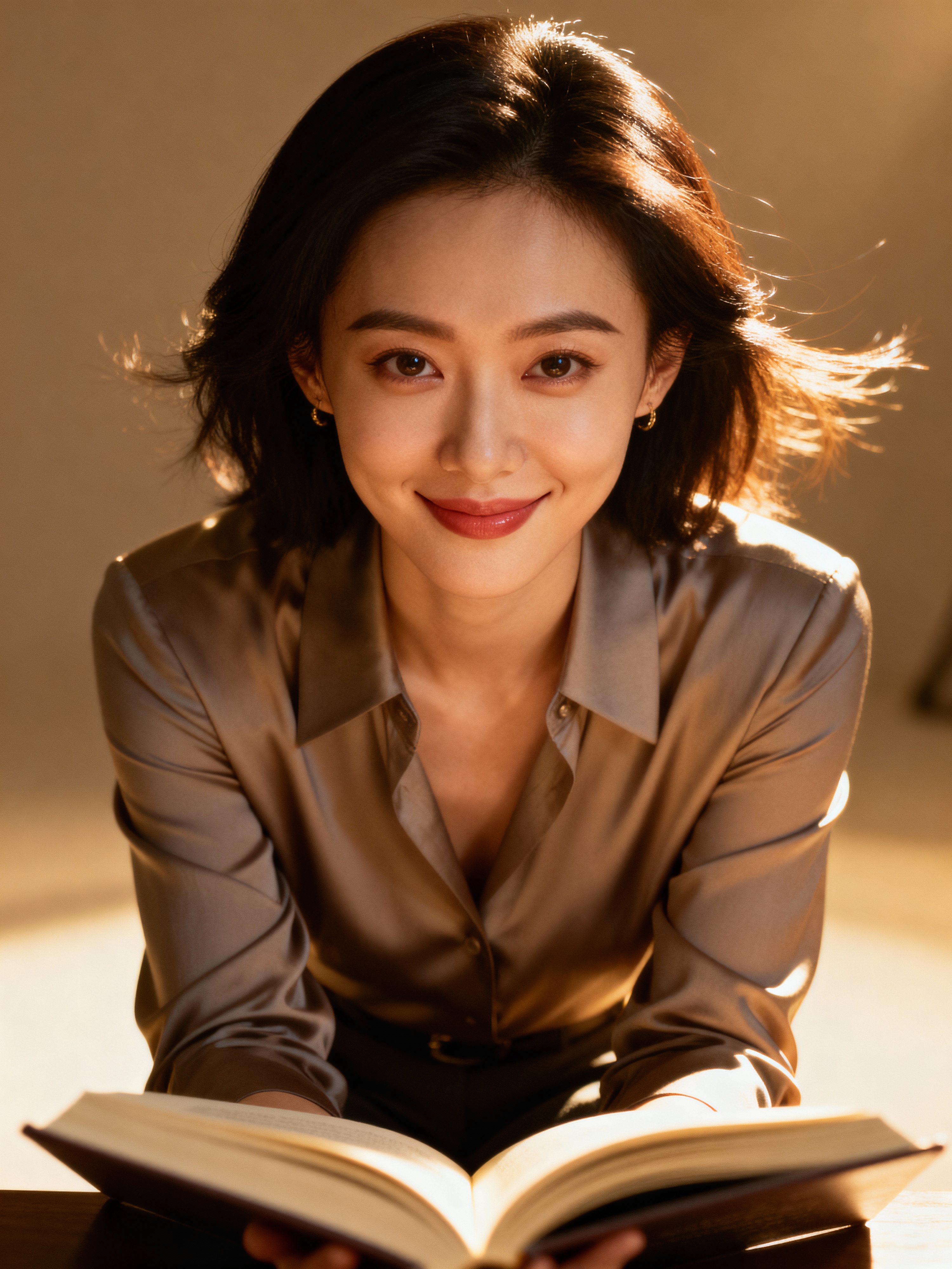 A professional author headshot of a thoughtful model, taken in a well-lit studio with a plain backdrop. The model is dressed in a stylish, professional blouse with natural makeup and a contemplative smile . The lighting is soft and even, highlighting their facial features with a warm and intellectual expression. The focus is sharp, capturing the model's eyes and thoughtful smile, creating a perfect headshot for book covers and professional profiles.