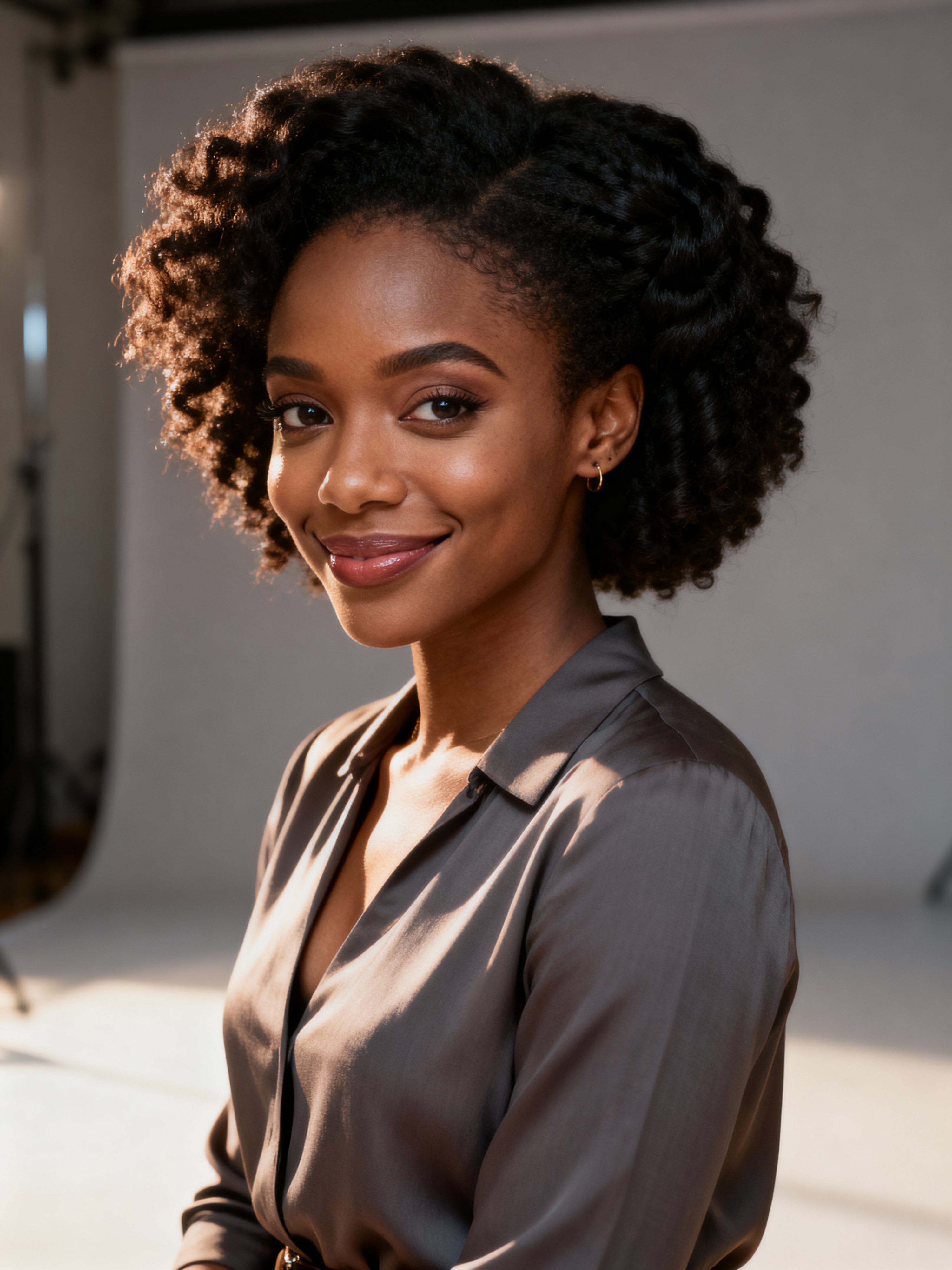 A professional author headshot of a thoughtful model, taken in a well-lit studio with a plain backdrop. The model is dressed in a stylish, professional blouse with natural makeup and a contemplative smile . The lighting is soft and even, highlighting their facial features with a warm and intellectual expression. The focus is sharp, capturing the model's eyes and thoughtful smile, creating a perfect headshot for book covers and professional profiles.