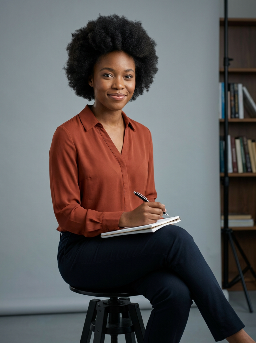A professional author headshot of a thoughtful model, taken in a well-lit studio with a plain backdrop. The model is dressed in a stylish, professional blouse with natural makeup and a contemplative smile . The lighting is soft and even, highlighting their facial features with a warm and intellectual expression. The focus is sharp, capturing the model's eyes and thoughtful smile, creating a perfect headshot for book covers and professional profiles.