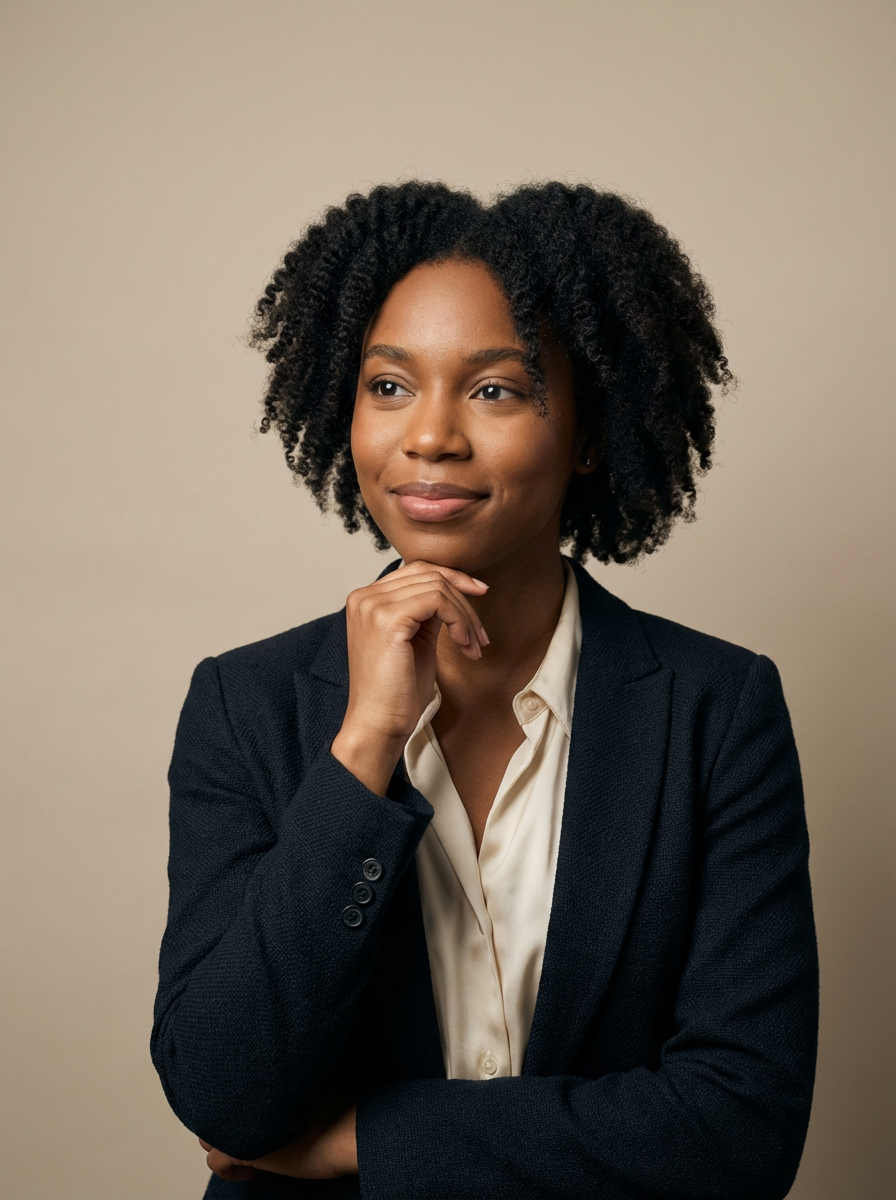 A professional author headshot of a thoughtful model, taken in a well-lit studio with a plain backdrop. The model is dressed in a stylish, professional blouse with natural makeup and a contemplative smile . The lighting is soft and even, highlighting their facial features with a warm and intellectual expression. The focus is sharp, capturing the model's eyes and thoughtful smile, creating a perfect headshot for book covers and professional profiles.