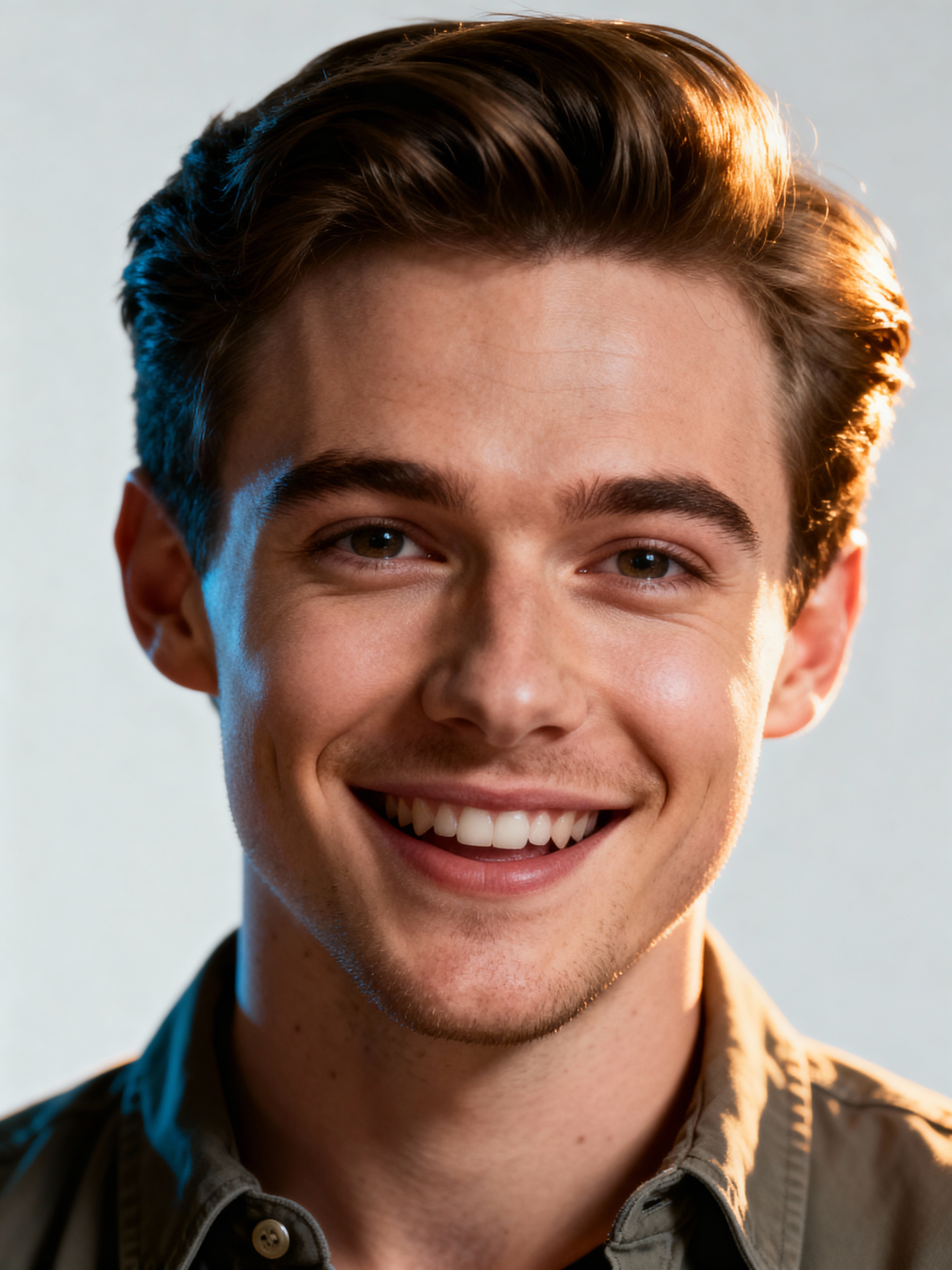 A professional comedian headshot taken in a well-lit studio with a clean, neutral backdrop. The model is dressed in a fitted button-up shirt or a casual jacket with neatly styled hair, ensuring a polished yet approachable look. The lighting is soft and even, highlighting the model\'s expressive face, charisma, and subtle comedic charm. The focus is sharp, capturing a warm and inviting expression, creating the perfect headshot for stand-up comedians, improv actors, and comedic performers.