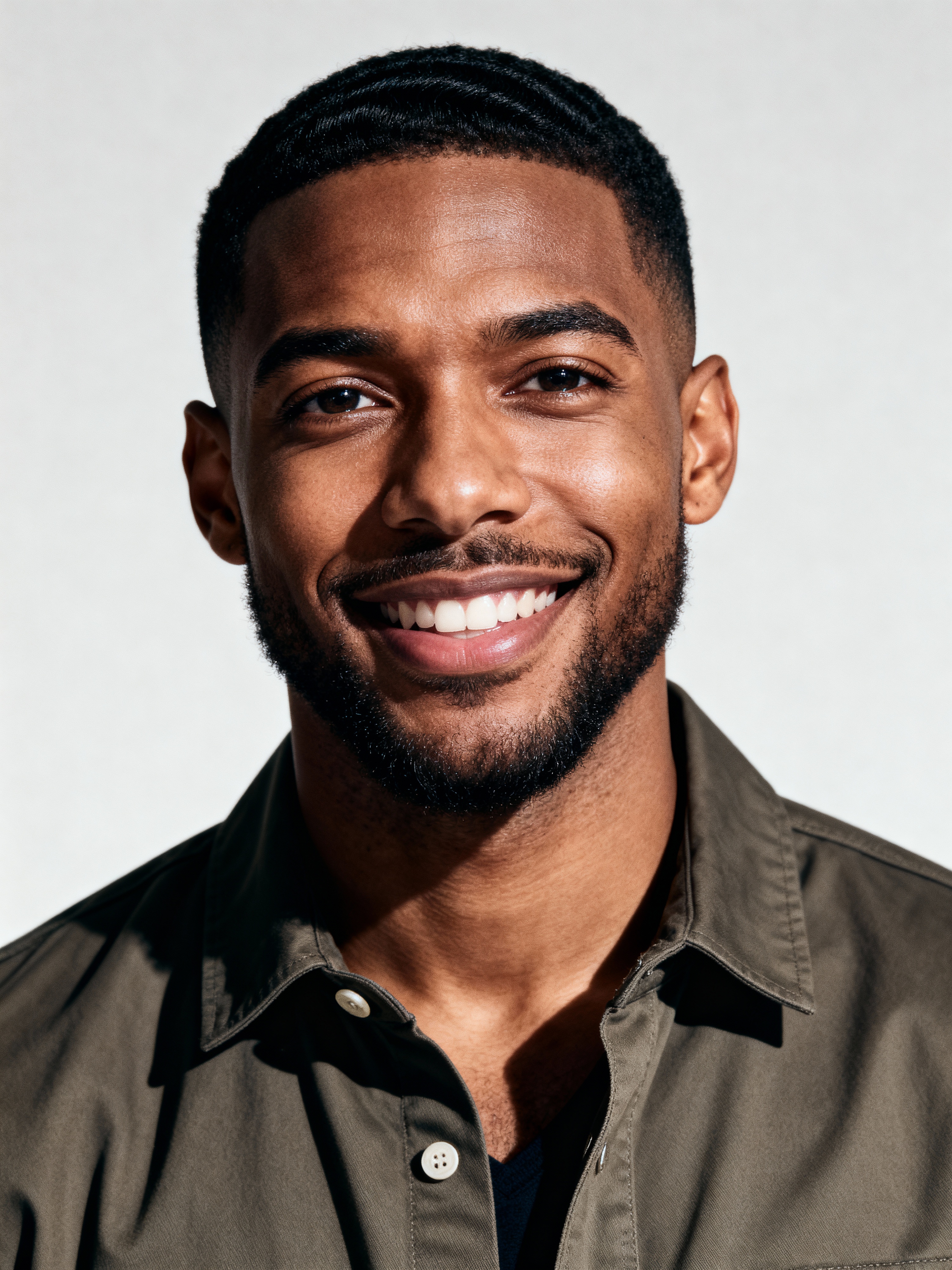A professional comedian headshot taken in a well-lit studio with a clean, neutral backdrop. The model is dressed in a fitted button-up shirt or a casual jacket with neatly styled hair, ensuring a polished yet approachable look. The lighting is soft and even, highlighting the model\'s expressive face, charisma, and subtle comedic charm. The focus is sharp, capturing a warm and inviting expression, creating the perfect headshot for stand-up comedians, improv actors, and comedic performers.