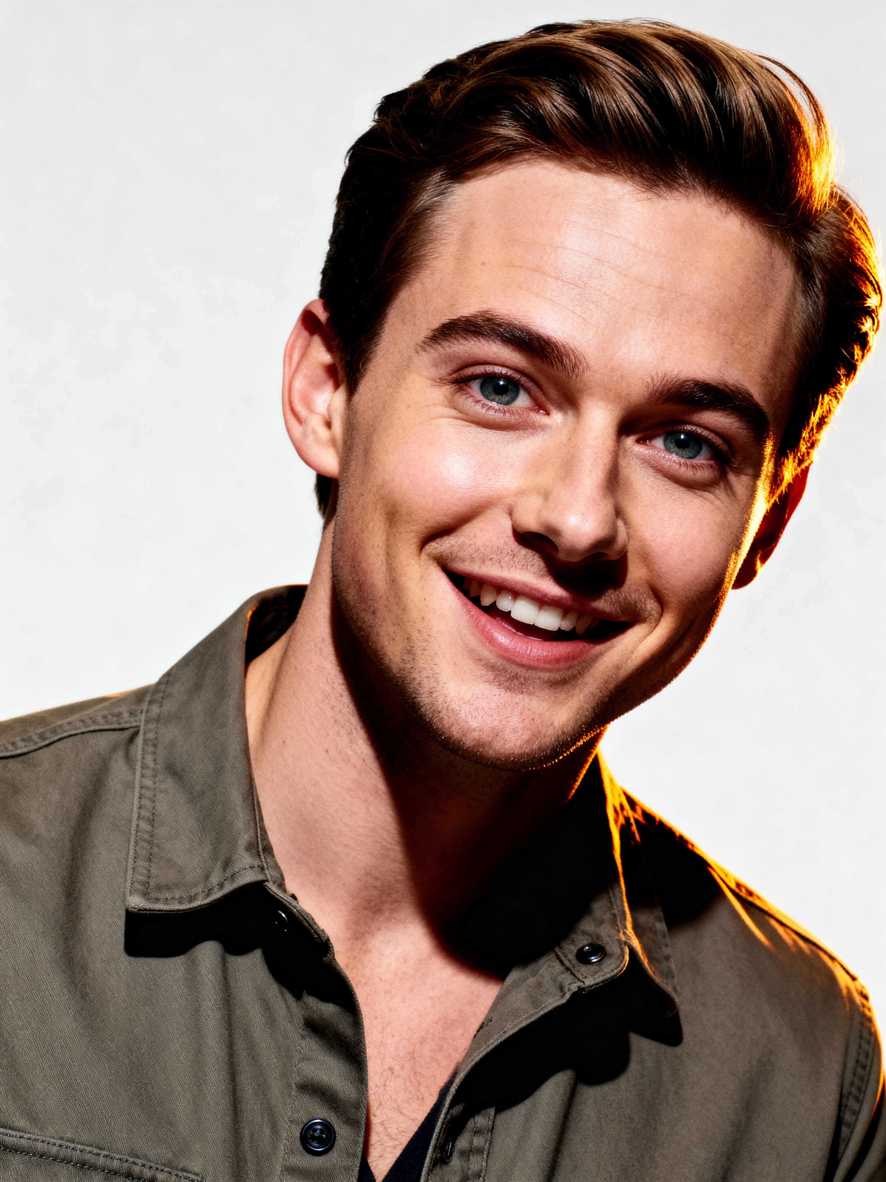 A professional comedian headshot taken in a well-lit studio with a clean, neutral backdrop. The model is dressed in a fitted button-up shirt or a casual jacket with neatly styled hair, ensuring a polished yet approachable look. The lighting is soft and even, highlighting the model\'s expressive face, charisma, and subtle comedic charm. The focus is sharp, capturing a warm and inviting expression, creating the perfect headshot for stand-up comedians, improv actors, and comedic performers.