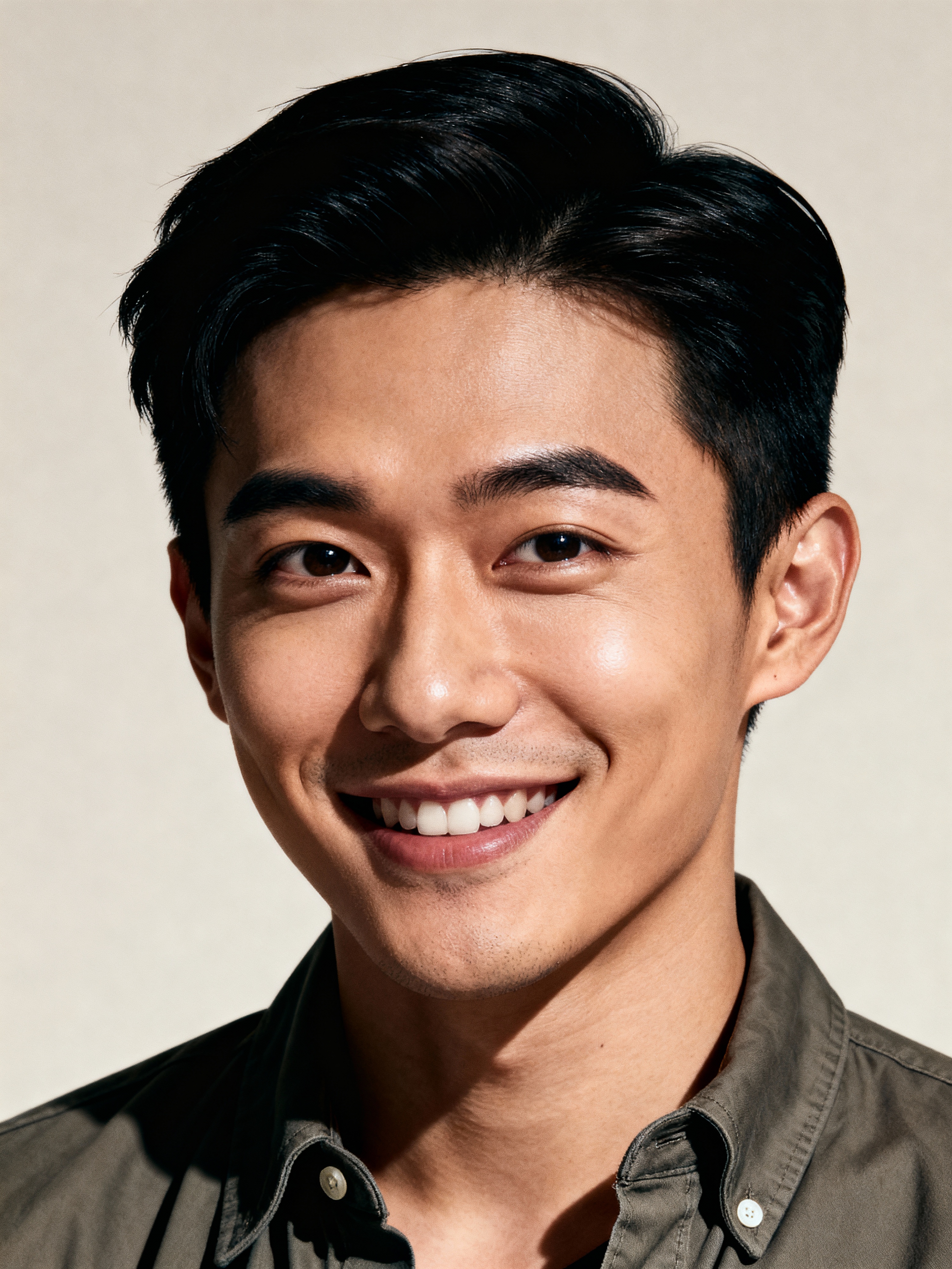 A professional comedian headshot taken in a well-lit studio with a clean, neutral backdrop. The model is dressed in a fitted button-up shirt or a casual jacket with neatly styled hair, ensuring a polished yet approachable look. The lighting is soft and even, highlighting the model\'s expressive face, charisma, and subtle comedic charm. The focus is sharp, capturing a warm and inviting expression, creating the perfect headshot for stand-up comedians, improv actors, and comedic performers.