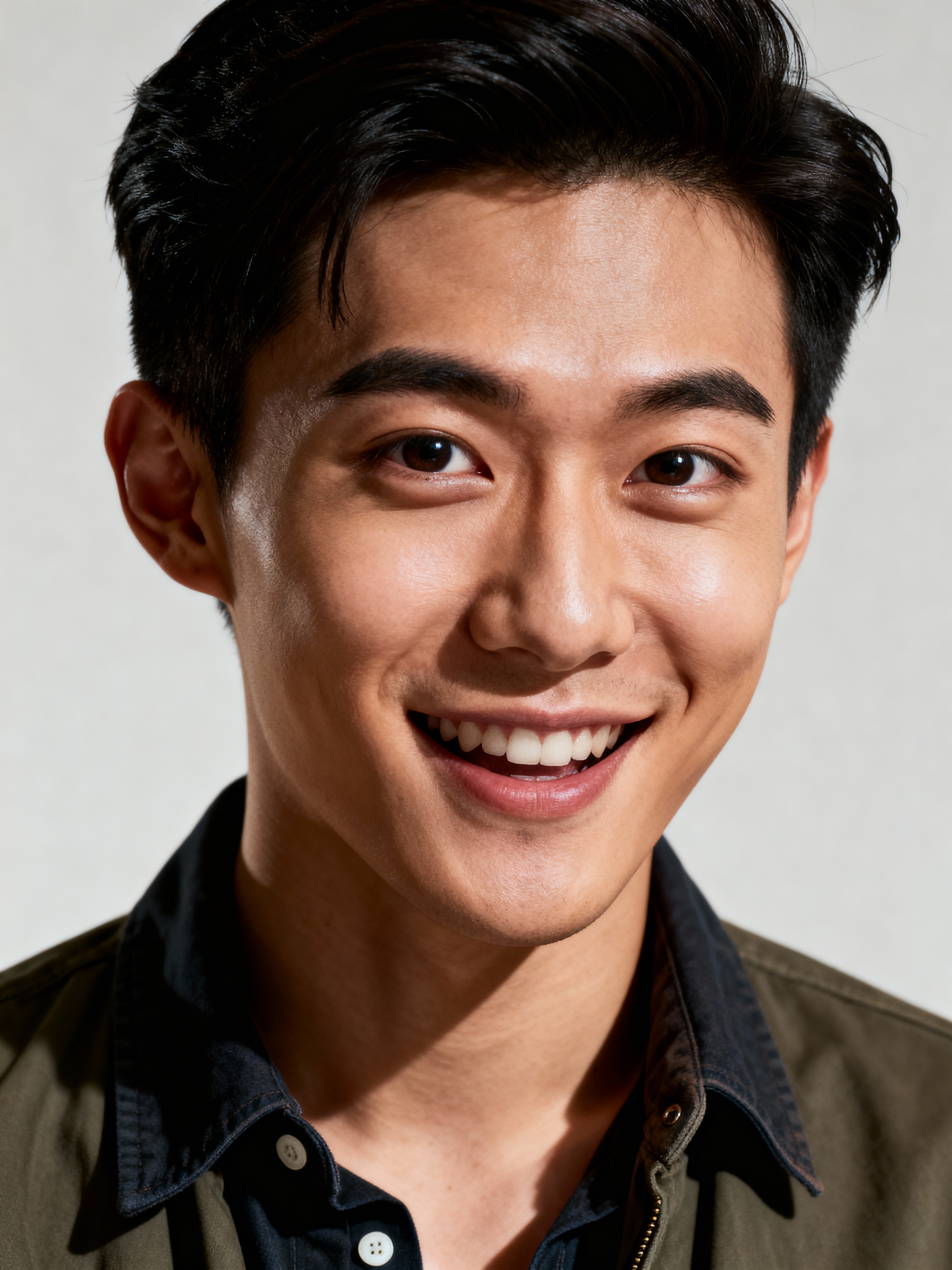 A professional comedian headshot taken in a well-lit studio with a clean, neutral backdrop. The model is dressed in a fitted button-up shirt or a casual jacket with neatly styled hair, ensuring a polished yet approachable look. The lighting is soft and even, highlighting the model\'s expressive face, charisma, and subtle comedic charm. The focus is sharp, capturing a warm and inviting expression, creating the perfect headshot for stand-up comedians, improv actors, and comedic performers.