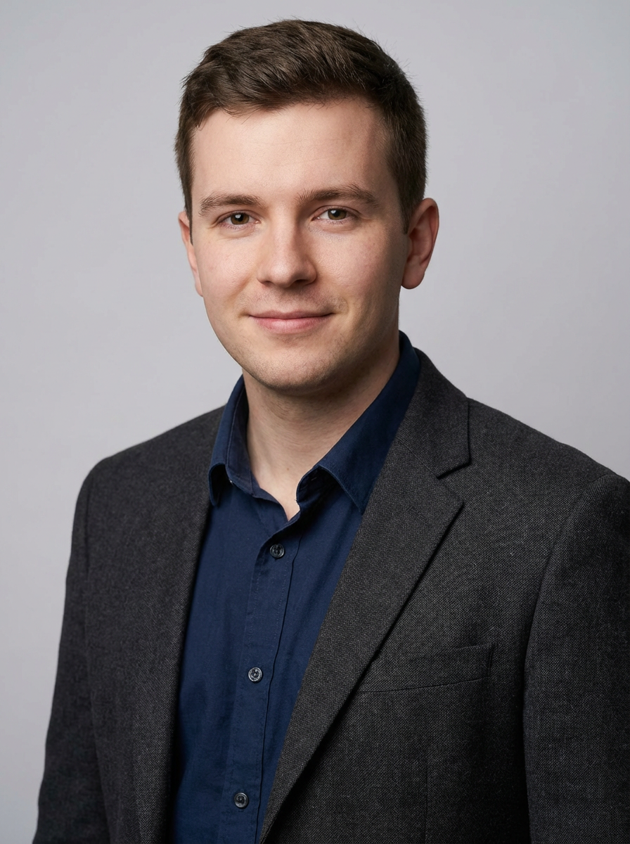 A professional comedian headshot taken in a well-lit studio with a clean, neutral backdrop. The model is dressed in a fitted button-up shirt or a casual jacket with neatly styled hair, ensuring a polished yet approachable look. The lighting is soft and even, highlighting the model\'s expressive face, charisma, and subtle comedic charm. The focus is sharp, capturing a warm and inviting expression, creating the perfect headshot for stand-up comedians, improv actors, and comedic performers.