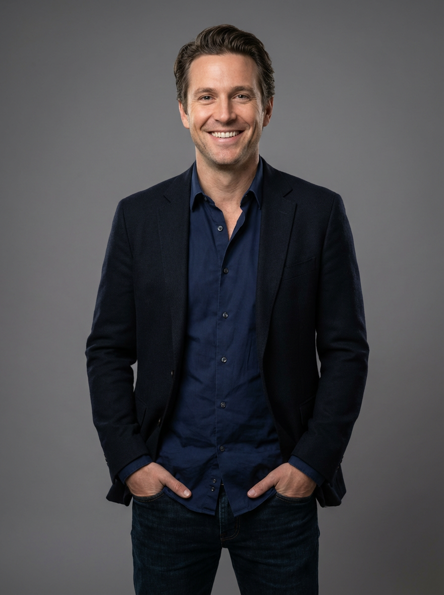 A professional comedian headshot taken in a well-lit studio with a clean, neutral backdrop. The model is dressed in a fitted button-up shirt or a casual jacket with neatly styled hair, ensuring a polished yet approachable look. The lighting is soft and even, highlighting the model\'s expressive face, charisma, and subtle comedic charm. The focus is sharp, capturing a warm and inviting expression, creating the perfect headshot for stand-up comedians, improv actors, and comedic performers.