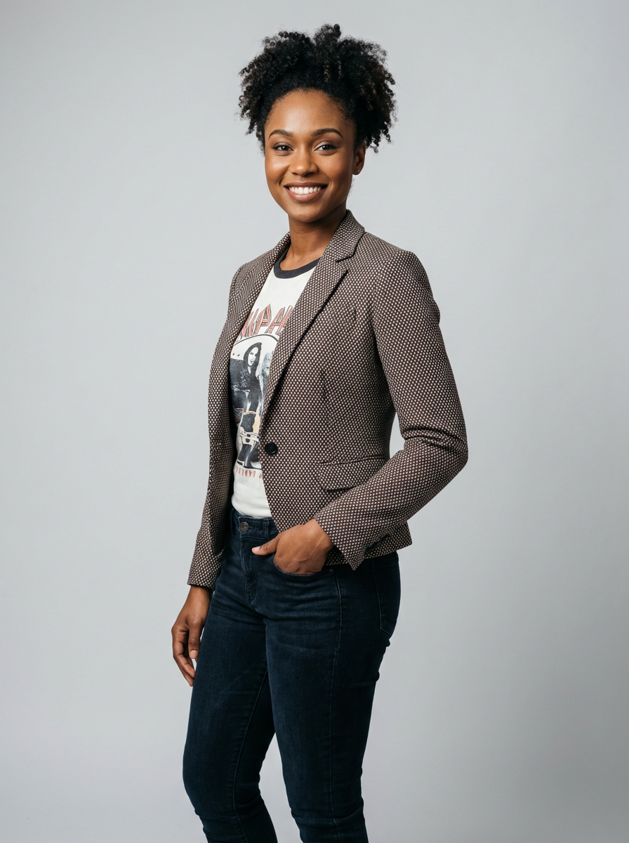 A professional comedian headshot taken in a well-lit studio with a clean, neutral backdrop. The model is dressed in a stylish yet playful fitted top with natural makeup and a confident smile , ensuring a polished yet approachable look. The lighting is soft and even, highlighting the model\'s expressive face, charisma, and subtle comedic charm. The focus is sharp, capturing a warm and inviting expression, creating the perfect headshot for stand-up comedians, improv actors, and comedic performers.